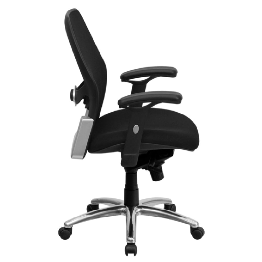 The Flash Furniture LF-W42-GG Executive Swivel Office Chair 38-3/5" to 41-7/10" adjustable height is a sophisticated seating solution tailored to meet the ergonomic needs of professionals. With a robust 250 lb. weight capacity, this chair caters to diverse market segments by combining comfort and durability. Its mid-back design features a ventilated super mesh back, promoting optimal airflow for long hours of sitting. The padded super mesh upholstered waterfall seat enhances comfort, reducing pressure on the legs. This chair is equipped with a height and tension adjustable built-in lumbar support, ensuring proper posture and personalized comfort. The knee tilt mechanism and tilt tension adjustment knob offer seamless reclining and flexibility. Additionally, the height and width adjustable padded arms add an extra layer of customization. Constructed with CA117 fire retardant foam, this chair prioritizes safety and compliance. The heavy duty chrome base and dual wheel casters provide stability and smooth mobility across office spaces. Available in a sleek black finish, the Flash Furniture LF-W42-GG chair requires assembly and promises quick delivery with in-stock items shipping within 24 hours. This chair is an exemplary choice for executive office environments, balancing style with function.