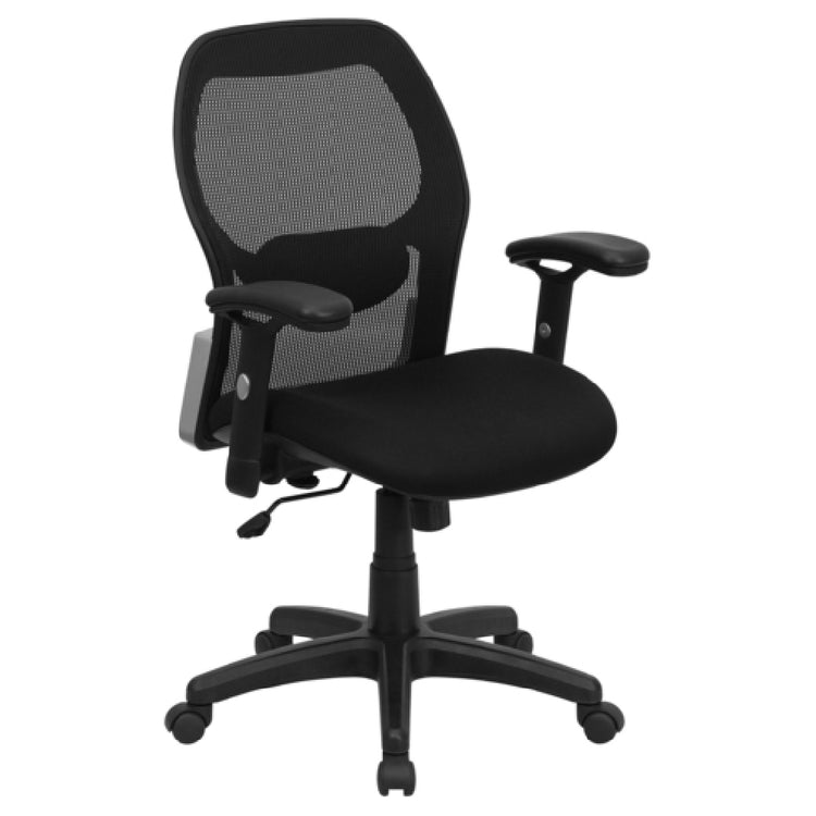 The Flash Furniture LF-W42B-GG Executive Swivel Office Chair is a meticulously designed seating solution catering to diverse office environments with its adjustable height of 38" to 41-9/10". Supporting up to 250 lb, this chair features a mid-back design that is both ergonomic and stylish, enhancing workplace productivity. The ventilated super mesh back offers superior breathability, keeping users cool and comfortable throughout prolonged use. Complementing this is the padded super mesh upholstered waterfall seat, which aids in reducing pressure on the legs. This chair is equipped with a height and tension adjustable built-in lumbar support that ensures optimal spinal alignment. The tilt lock mechanism and tilt tension adjustment knob provide customizable reclining options, while the height and width adjustable padded arms accommodate various user preferences. Constructed with CA117 fire retardant foam, it prioritizes safety alongside comfort. Its heavy-duty black nylon base, paired with dual wheel casters, ensures stability and ease of mobility across different floor surfaces. Available in black, this office chair requires assembly, and in-stock items are typically shipped within 24 hours, making it a practical choice for both small businesses and large corporate offices seeking quality and efficiency in office furniture solutions.