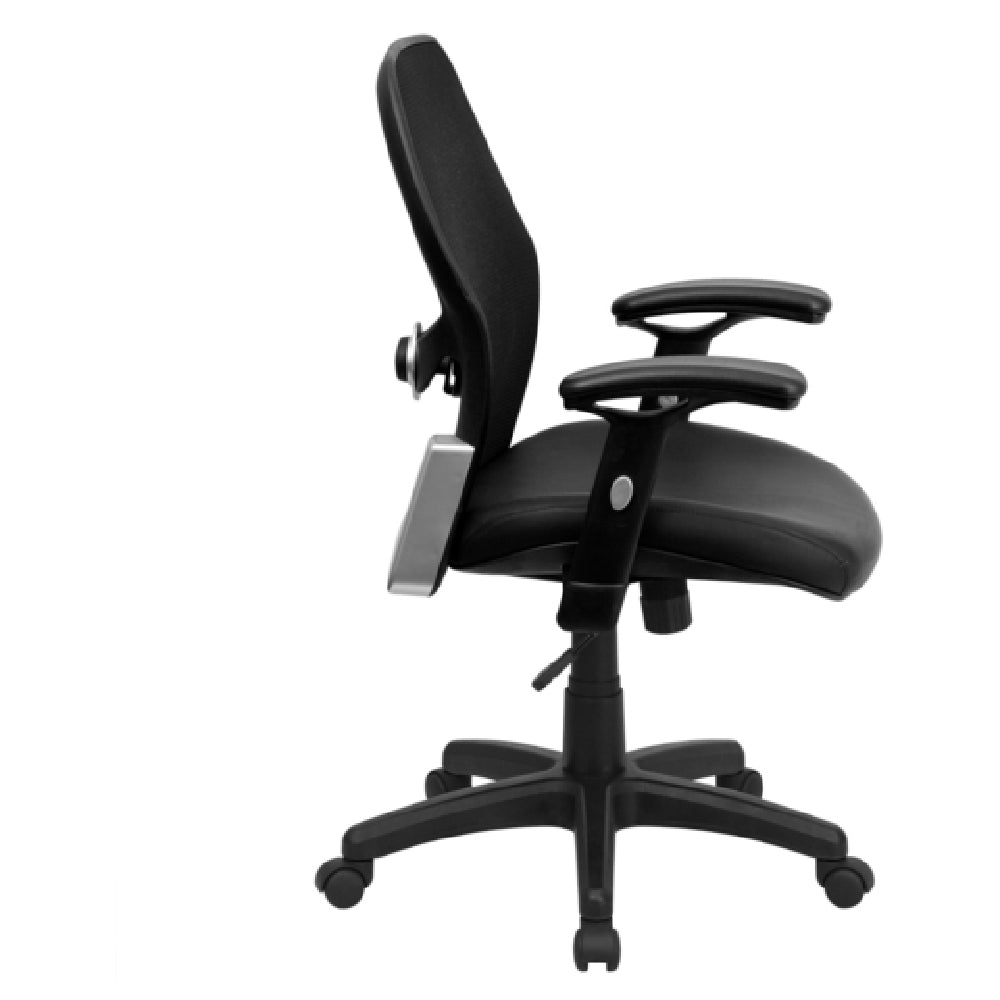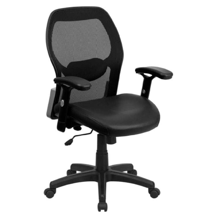 Flash Furniture LF-W42B-L-GG Executive Swivel Office Chair 38" to 41-9/10" Adjustable Height is a versatile seating solution designed to cater to diverse office environments. With an adjustable height range from 38 inches to 41-9/10 inches, this chair ensures ergonomic comfort for users of varying statures. The mid-back design, combined with a ventilated super mesh back, provides superior breathability and support, making it ideal for long hours of sitting. The padded leather upholstered waterfall seat enhances comfort by promoting better circulation. This chair features height and tension adjustable built-in lumbar support, which is crucial for maintaining proper posture. The tilt lock mechanism and tilt tension adjustment knob allow users to customize their seating position for maximum comfort and productivity. Additionally, the height and width adjustable padded arms cater to individual ergonomic needs. The chair's CA117 fire retardant foam emphasizes safety, while the heavy-duty black nylon base and dual wheel casters ensure stability and mobility across different floor surfaces. With a weight capacity of 250 lb., this executive chair accommodates a wide range of users. Whether in a corporate setting or a home office, the Flash Furniture LF-W42B-L-GG offers a blend of functionality and comfort, tailored to meet the demands of today's professionals.