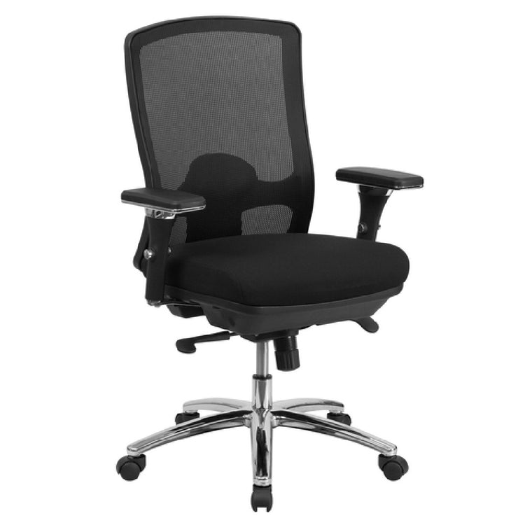 The Flash Furniture LQ-2-BK-GG Hercules Series 24/7 Big & Tall Swivel Office Chair is a robust and versatile seating solution designed for rigorous use across various sectors. This chair accommodates a weight capacity of up to 350 lbs, suitable for big and tall individuals, and is crafted for 24/7 intensive multi-shift use, making it ideal for environments such as call centers, control rooms, and other demanding workplaces. Its mid-back design features a 20"W x 3" thick padded suspension seat and a ventilated mesh back that ensures comfort and durability. The chair is upholstered in high-quality fabric and includes built-in lumbar support, providing essential ergonomic benefits. Its dual paddle control mechanism and 2-to-1 Synchro tilt adjustment, complemented by a tilt tension adjustment knob, allow for personalized seating positions. The 3-D height adjustable pivot and slider padded arms enhance user comfort. Safety is assured with CA117 fire retardant foam, and the chair rests on a heavy-duty chrome base equipped with dual wheel casters for smooth mobility. With dimensions adjustable from 41" to 44-1/2", this chair requires assembly, and in-stock items usually ship within 24 hours, streamlining operations for businesses needing swift deployment.