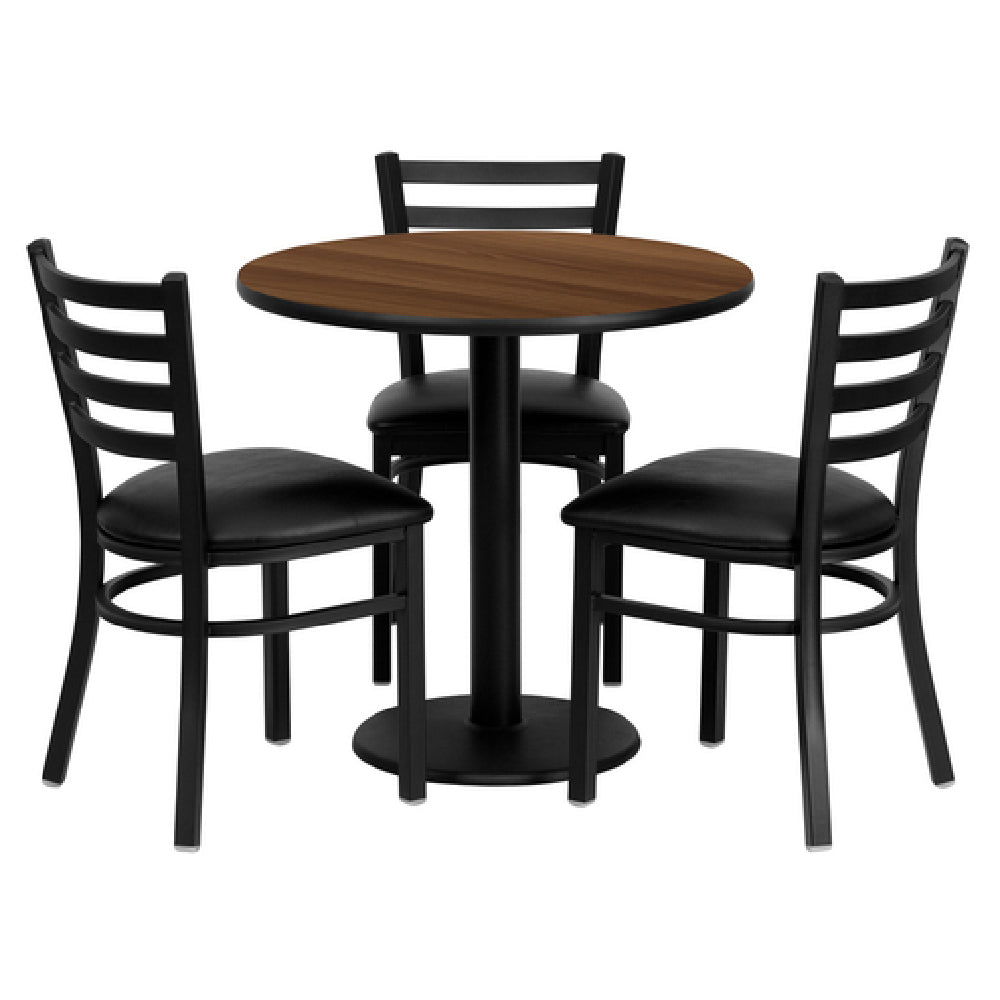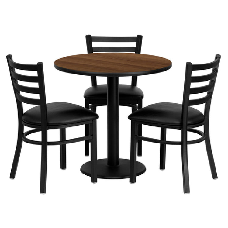 The Flash Furniture MD-0002-GG Table and Chair Set offers a comprehensive solution for both commercial and residential spaces, combining functionality with aesthetic appeal. This set includes a 30" diameter x 30" high round table, featuring a black T-mold edge and a robust MDF core with a high-impact melamine surface. The table is finished with a walnut laminate, and its stability is ensured by a cast iron round base with a durable black powder-coated finish. Complementing the table are three chairs, each measuring 16-1/2" wide x 17" deep x 32-1/4" high. The chairs boast a metal ladder back design with black vinyl upholstered padded seats, filled with 2-1/2" thick CA117 fire retardant foam for added safety. The welded joint assembly and curved support bar enhance durability, while the 18-gauge steel frame with a black powder-coated finish provides a sleek look. Plastic floor glides protect surfaces, making this set versatile for various environments. The product ships in five boxes with a lead time of 1-2 business days and requires assembly. This set is designed to cater to the diverse needs of the hospitality and catering industries, offering both style and practicality.