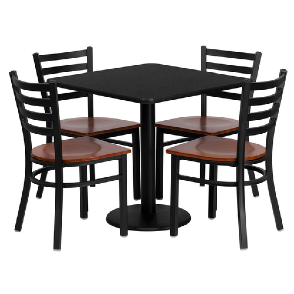 Flash Furniture MD-0003-GG Table and Chair Set is an ideal solution for both residential and commercial environments, offering a perfect blend of style and functionality. This set features a square table measuring 30"W x 30"D x 30"H, crafted with a black T-mold edge and a robust MDF core enhanced with high-impact melamine. The table’s black laminate finish and cast iron round base with a black powder-coated finish ensure a sleek and durable design. Accompanying the table are four chairs with dimensions of 16-1/2"W x 17"D x 32-1/4"H. Each chair boasts a metal ladder back, a 5/8" thick cherry finish plywood seat, and a welded joint assembly for enhanced stability. The curved support bar and 18-gauge steel frame, finished with a black powder coat, contribute to the chairs' strength and longevity. Designed with plastic floor glides, this set protects floors from scratches, making it suitable for high-traffic areas. The versatility of the MD-0003-GG set is evident in its adaptability across various settings, requiring assembly and shipped in five boxes with a lead time of 1-2 business days. This set provides a reliable and stylish seating solution tailored for diverse market segments.
