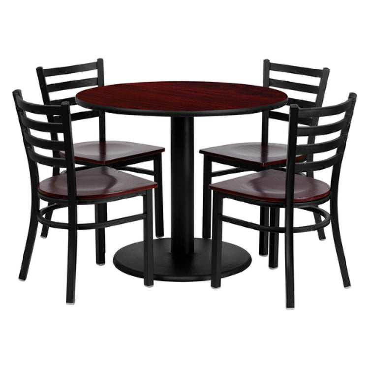 The Flash Furniture MD-0004-GG Table and Chair Set is a comprehensive ensemble designed for versatile use in both commercial and residential settings. This set includes a 36-inch diameter by 30-inch high table, featuring a durable round black T-mold edge and a high-impact melamine core, all enveloped in a sophisticated mahogany laminate finish. The table is supported by a sturdy cast iron round base, which is enhanced with a black powder-coated finish for added resilience and style. Accompanying the table are four chairs, each measuring 16-1/2 inches wide, 17 inches deep, and 32-1/4 inches high. The chairs are constructed with a robust metal ladder back and a 3/4-inch thick plywood seat finished in mahogany, ensuring both comfort and durability. Their welded joint assembly and curved support bar, coupled with an 18-gauge steel frame, provide a solid seating option, while plastic floor glides protect surfaces from scratches. This set is shipped in five boxes with a lead time of 1-2 business days and requires assembly upon delivery. The design and materials make it an excellent choice for a variety of environments, balancing aesthetic appeal with functional performance.
