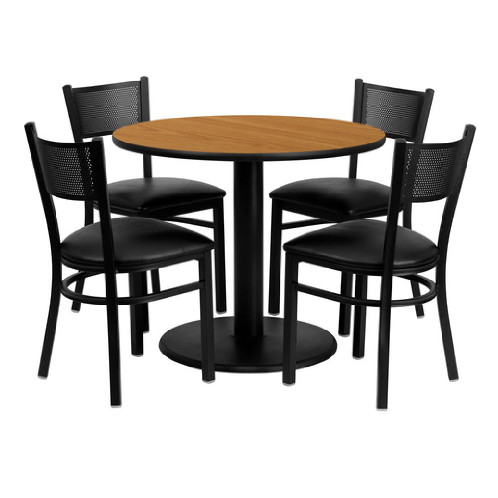 The Flash Furniture MD-0006-GG Table And Chair Set is a comprehensive furniture solution, featuring a 36" diameter x 30" height table that perfectly complements both commercial and residential settings. This table is designed with a round black T-mold edge and incorporates an MDF with a high impact melamine core, accentuated by a natural laminate finish, ensuring durability and resistance to the wear of frequent use. The table's stability is guaranteed by a cast iron round base with a sleek black powder-coated finish. Accompanying the table are four chairs, each measuring 17-1/4" width x 20" depth x 33-1/4" height. These chairs boast a metal back with a distinctive grid design and a black vinyl upholstered padded seat, filled with 2-1/2" thick 1.4 density CA117 fire retardant foam for enhanced comfort and safety. The chairs are engineered with welded joint assembly and a curved support bar, made from 18 gauge steel with a black powder-coated frame for long-lasting use. Plastic floor glides are included to protect flooring surfaces. This set is meticulously designed to cater to diverse market segments, offering practicality and style, and requires assembly. It is shipped in five boxes with a 1-2 business days lead time.