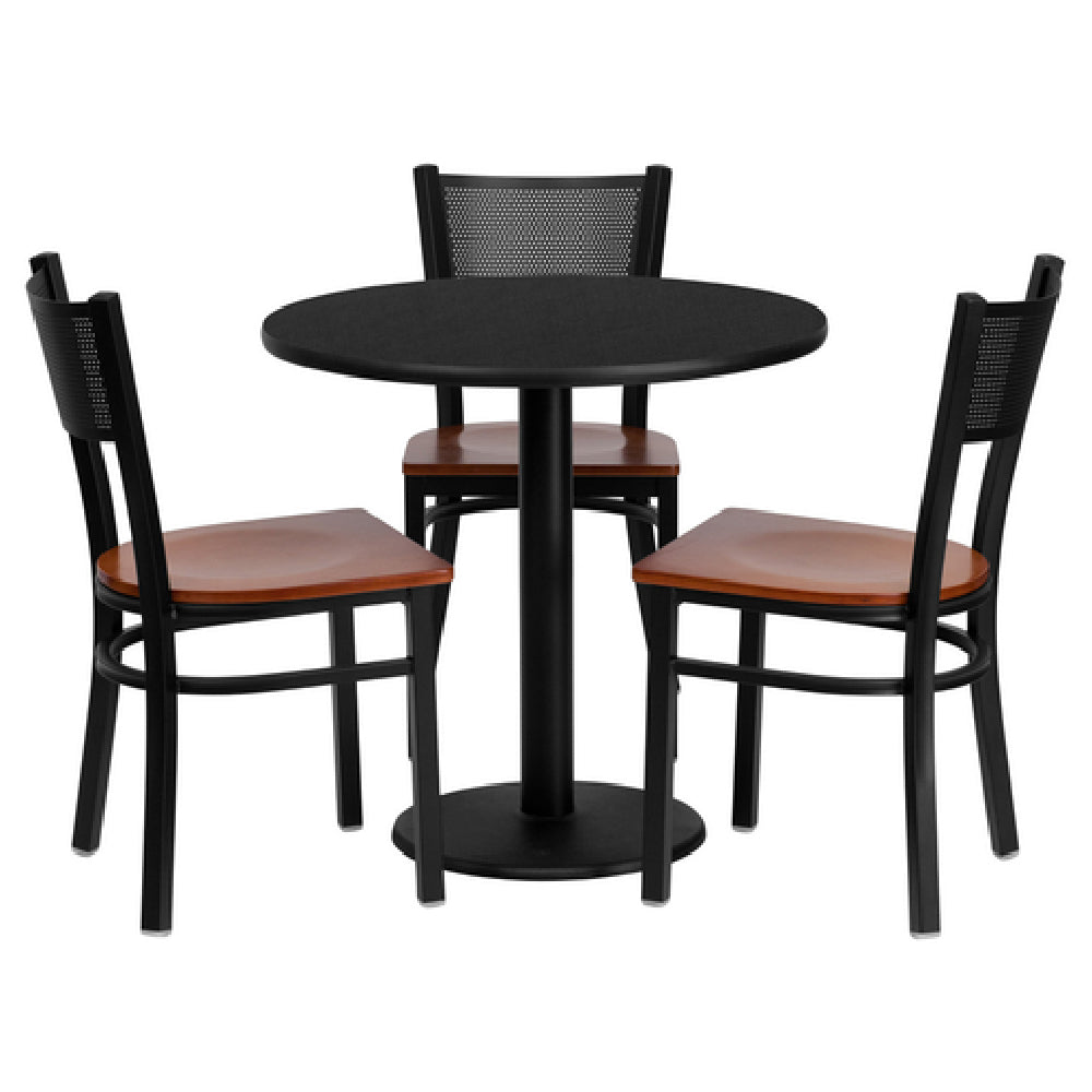 The Flash Furniture MD-0007-GG Table And Chair Set includes a 30-inch diameter round table with a height of 30 inches, making it suitable for both commercial and residential settings. The table features a black T-mold edge and is constructed from medium-density fiberboard (MDF) with a high impact melamine core. The black laminate finish provides a sleek appearance while the cast iron round base with a black powder-coated finish adds durability and stability. Accompanying the table are three chairs, each measuring 17-1/4 inches in width, 20 inches in depth, and 33-1/4 inches in height. The chairs boast a metal back with a grid design and a 3/4 inch thick cherry finish plywood seat, ensuring both comfort and style. They are constructed with a welded joint assembly and include a curved support bar for added strength. The frames of the chairs are made of 18-gauge steel with a black powder-coated finish and are equipped with plastic floor glides to protect flooring surfaces. Designed for versatility, this set can easily complement a variety of interior settings, whether used in a home dining area or a commercial dining establishment. Assembly is required, and the product is shipped in five boxes with a lead time of 1-2 business days.
