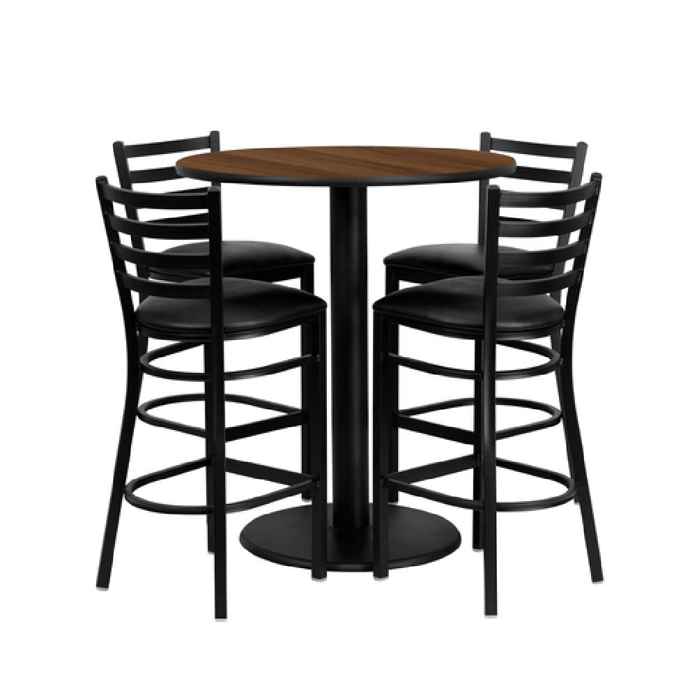 The Flash Furniture MD-0011-GG Table and Bar Stool Set consists of a 36-inch diameter by 42-inch high round table, making it a versatile addition to both commercial and residential settings. The table features a black T-mold edge and an MDF with a high-impact melamine core, finished in a walnut laminate. Its stability is enhanced by a cast iron round base with a durable black powder-coated finish. Accompanying the table are four bar stools, each measuring 17 inches wide by 18 inches deep by 42-1/4 inches high. These stools are designed with metal ladder backs and black vinyl upholstered padded seats, filled with 2-1/2-inch thick CA117 fire retardant foam. The stools boast a welded joint assembly, two curved support bars, and a footrest for added comfort, all held together by an 18-gauge steel frame finished in black powder coating. Plastic floor glides are included to protect flooring surfaces. The set is designed for easy assembly and is shipped in five boxes, with a lead time of 1-2 business days. This robust set is a perfect blend of functionality and style, catering to both residential and commercial use with its high-quality materials and thoughtful design.
