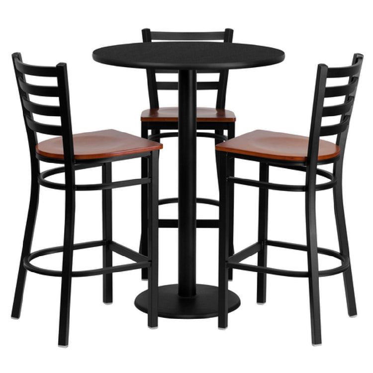 The Flash Furniture MD-0013-GG Table and Bar Stool Set is an ideal solution for both commercial and residential spaces, featuring a 30-inch diameter x 42-inch high table that combines functionality with a sleek design. The table is crafted with a high-impact melamine core and topped with a black laminate finish, while the black T-mold edge offers additional durability. Its stability is ensured by a robust cast iron round base with a black powder-coated finish. Accompanying the table are four bar stools, each measuring 17 inches wide x 18 inches deep x 42-1/4 inches high. The stools feature a metal ladder back design and 3/4-inch thick cherry finish plywood seats, providing both comfort and style. They are constructed with welded joint assembly and reinforced with two curved support bars and a footrest. The 18-gauge steel frames are powder-coated in black, ensuring longevity, and include plastic floor glides to protect surfaces. This versatile set is designed for easy assembly and can fit seamlessly into a variety of settings, from bustling cafes to home bars. Delivered in five boxes with a lead time of 1-2 business days, it ensures both convenience and quality.