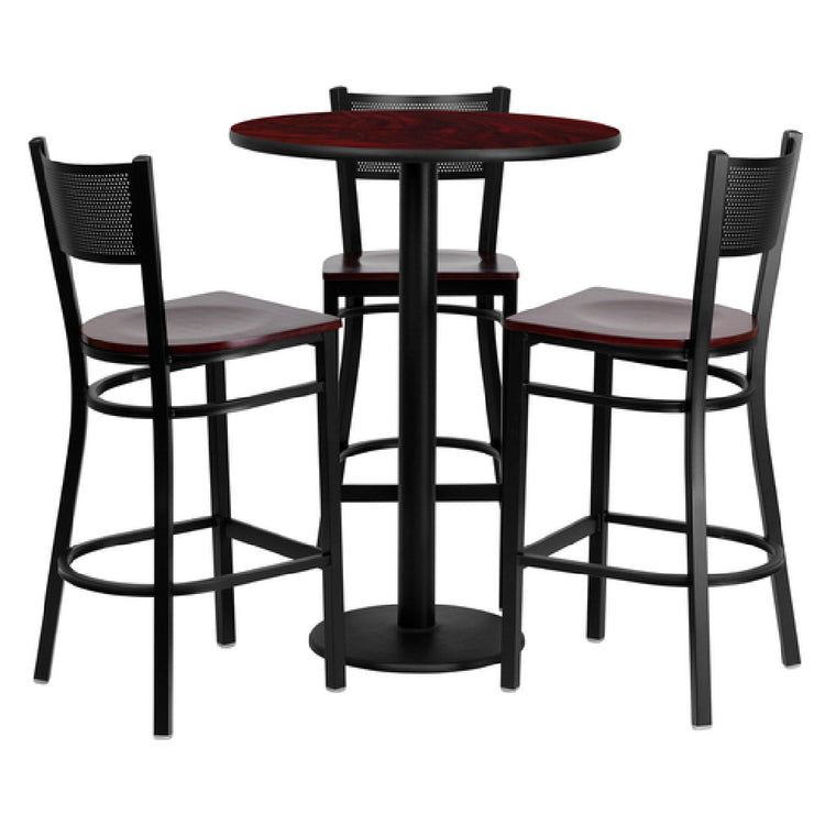 The Flash Furniture MD-0017-GG Table and Bar Stool Set is a comprehensive package designed for both commercial and residential settings, combining functionality with style. This set includes a round table with dimensions of 30 inches in diameter and 42 inches in height, featuring a black T-mold edge and a robust MDF structure with a high-impact melamine core. The table's mahogany laminate finish is complemented by a cast iron round base with a sleek black powder-coated finish, ensuring durability and aesthetic appeal. Accompanying the table are three bar stools, each measuring 19 inches wide, 19-1/2 inches deep, and 42-1/4 inches high. These stools are constructed with a metal back showcasing a grid design and a 3/4-inch thick mahogany finish plywood seat, ensuring both comfort and style. The welded joint assembly, paired with two curved support bars and a footrest, provides stability. Crafted with an 18-gauge steel frame and black powder coating, these stools are equipped with plastic floor glides to protect surfaces. This set requires assembly and is shipped in five boxes with a lead time of 1-2 business days. Its design caters to diverse market segments, offering a versatile and aesthetically pleasing solution for various environments.