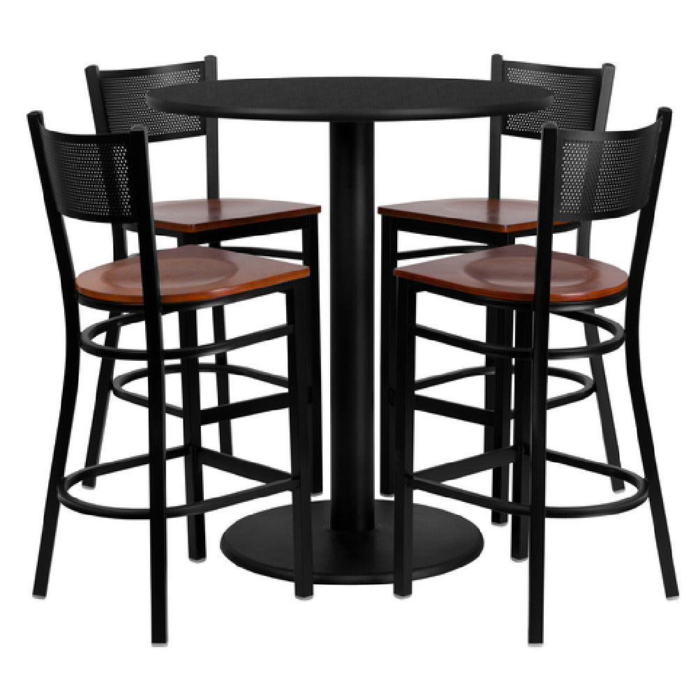 Flash Furniture MD-0018-GG Table And Bar Stool Set is an exemplary choice for both commercial and residential spaces, combining elegant design with practical features. This set includes a 36" diameter x 42" height table that showcases a round design enhanced by a sleek black T-mold edge. Constructed with MDF and a high-impact melamine core, the table is finished with a durable black laminate and supported by a sturdy cast iron round base, coated in black powder for a refined appearance. Accompanying the table are four bar stools, each measuring 19"W x 19-1/2"D x 42-1/4"H, featuring a metal back with a stylish grid design. The 3/4" thick plywood seats boast a rich cherry finish, adding a touch of warmth and sophistication. The stools are built with welded joint assembly, curved support bars, and a footrest, ensuring comfort and durability. The frame is constructed from 18 gauge steel with a black powder-coated finish, and includes plastic floor glides to protect flooring surfaces. This set is shipped in five boxes, with assembly required, and is designed to cater to diverse market segments by offering versatility and functionality with its robust construction and timeless aesthetic, all available with a 1-2 business days lead time.