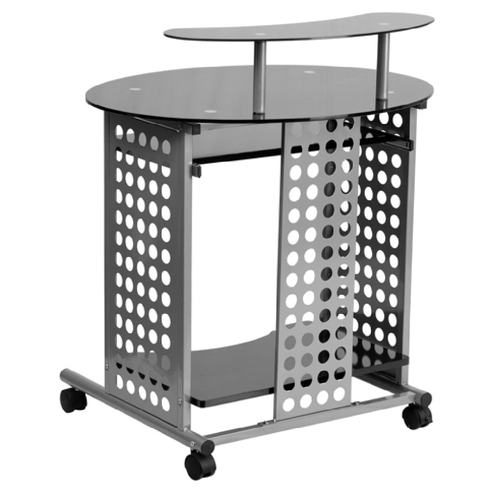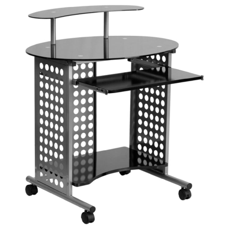 Flash Furniture NAN-CASSINI-GG Computer Desk - 31-1/4"W x 25-1/4"D x 35-3/4"H Mobile stands out with its sleek design and functional versatility, making it a valuable addition to any workspace. This mobile desk features a striking black tempered glass top, providing both durability and a modern aesthetic. The desk is equipped with a 25-3/4"W x 7-7/8"D monitor platform, which offers ample space for various monitor sizes, while the 21-1/8"W x 11"D sliding keyboard tray ensures ergonomic convenience. Additionally, a bottom shelf provides extra storage, enhancing organization for users. The structure is supported by a silver powder-coated perforated metal frame, which not only adds to the desk's durability but also contributes to its contemporary look. Equipped with (4) dual wheel casters, including (2) locking wheels, this desk ensures easy mobility and stability. Assembly is required, and the product typically ships within 24 hours for in-stock items, ensuring a quick setup process. The Flash Furniture NAN-CASSINI-GG is ideal for diverse market segments, including home offices, corporate environments, and educational settings, where both style and practicality are paramount.