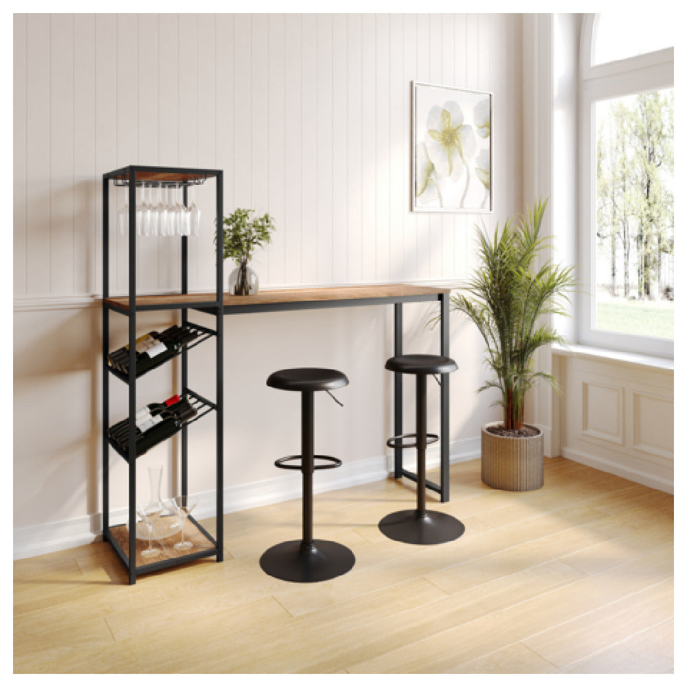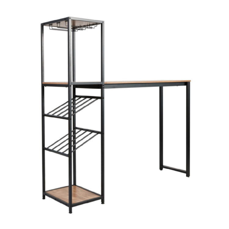 The Flash Furniture NAN-F-HY-B23102-BLKBRN-GG Jura Bar & Wine Table with (2) slanted shelves is a sophisticated addition to both residential and commercial spaces. This table is meticulously crafted with a black metal frame, offering strength and durability, while the light brown melamine table top provides a stylish and modern look. The design incorporates two slanted shelves, which are specifically engineered for optimal bottle storage and handling glass storage, allowing for easy access and organization. The combination of materials and design ensures that the table is not only functional but also an elegant statement piece. Ideal for hospitality settings, restaurants, or home bars, this unit caters to various market segments by providing a practical solution for wine and spirit enthusiasts. The structure of the Jura Bar & Wine Table allows it to seamlessly integrate into different interior styles, from contemporary to rustic. The thoughtful engineering behind the slanted shelving maximizes storage efficiency, making it a valuable asset for those who appreciate fine design combined with utility. This table exemplifies a blend of aesthetics and practicality, setting it apart within the industry for those seeking a quality and stylish bar and wine storage solution.