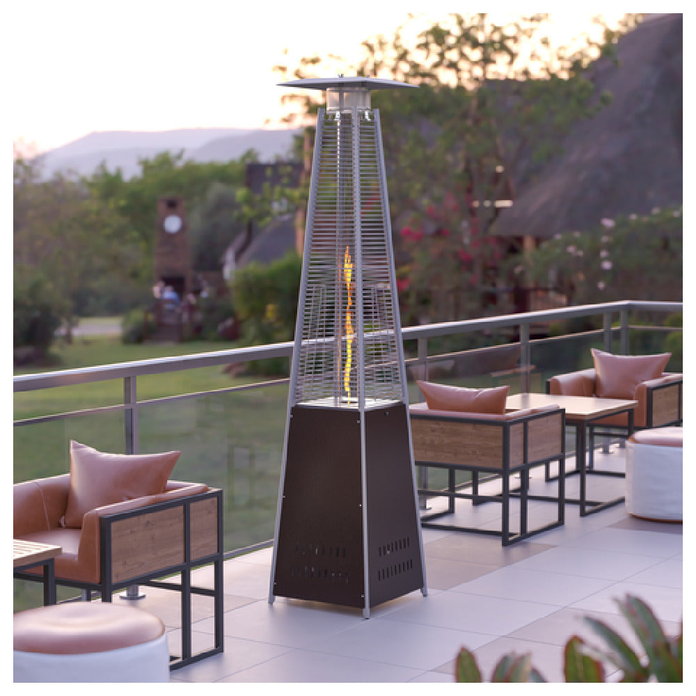 The Flash Furniture NAN-FSDC-02-BR-GG Outdoor Patio Heater is a versatile, pyramid-shaped unit standing at 90 inches tall, specifically designed for enhancing outdoor spaces with warmth and style. The heater operates with an electronic ignition system, ensuring easy and reliable start-up for consistent performance. It offers a powerful heat output of 42,000 BTU, making it suitable for various outdoor settings, from residential patios to commercial outdoor dining areas. Constructed with a durable stainless steel frame and accented with metal screws, this heater boasts both aesthetic appeal and robust strength. The safety shut-off valve feature underscores its commitment to user safety, automatically halting propane flow in case of emergencies. This patio heater requires one 20 lb. propane tank for operation, although the tank is not included with the purchase. Finished in a sophisticated brown hue, it complements a wide range of outdoor décors while providing a welcoming warmth. Note that assembly is required prior to use, and the product is readily available for shipping within 24 hours of order placement. This portable heater is an ideal choice for those seeking reliable and efficient outdoor heating solutions without compromising on style or safety.
