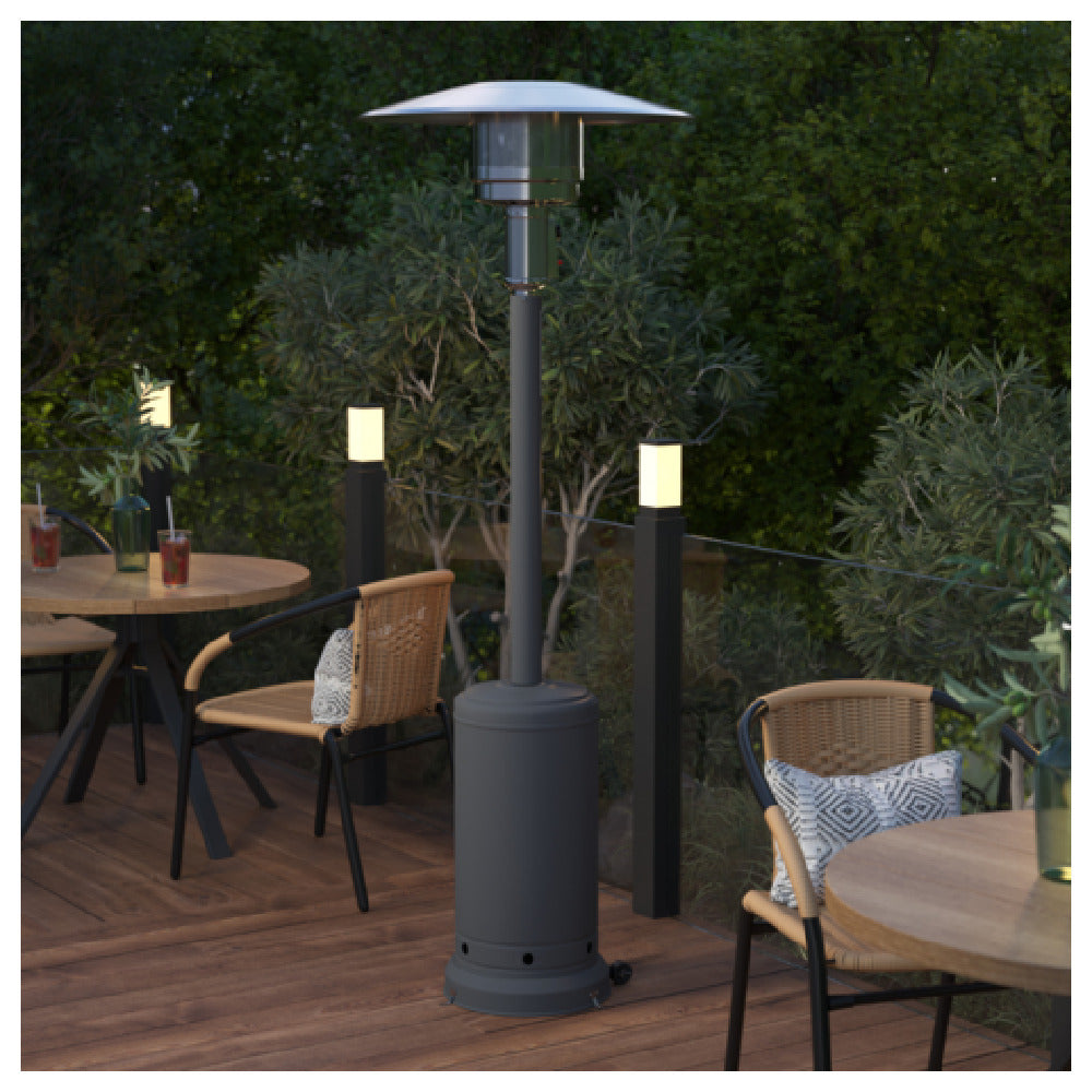 The Flash Furniture NAN-HSS-AGH-GY-GG Sol Patio Outdoor Propane Heater stands at an impressive 7-1/2 feet tall, providing substantial warmth for both commercial and residential environments. This heavy-duty heater delivers a powerful 42,000 BTU output, ensuring effective heating over a wide area. Designed with user convenience in mind, it comes equipped with wheels, facilitating easy mobility and positioning in various outdoor settings. The heater is constructed from durable stainless steel, contributing to its robust build and longevity, and is finished in an elegant gray color that complements a variety of outdoor décors. Its versatile design makes it suitable for a range of market segments, from bustling restaurant patios seeking to extend their outdoor seating season, to homeowners desiring a cozy and stylish solution for their backyard gatherings. The Flash Furniture Sol Patio Outdoor Propane Heater combines high performance with sleek aesthetics, making it a practical and attractive addition to any outdoor space.