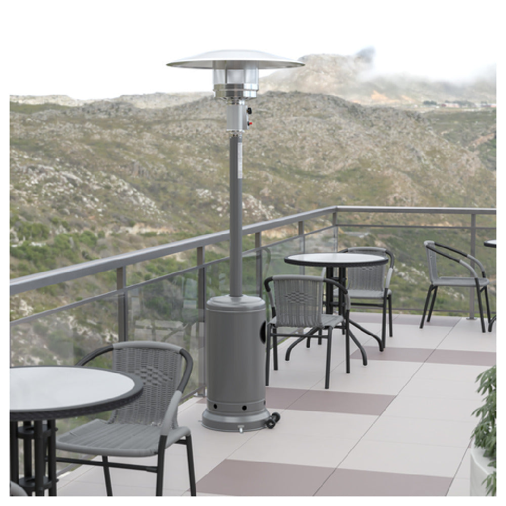 The Flash Furniture NAN-HSS-AGH-SL-GG Outdoor Patio Heater stands as a versatile heating solution with its impressive height of 87 inches, making it a prominent addition to any outdoor setting. Constructed with a durable stainless steel frame and secured with metal screws, this portable patio heater exudes resilience and reliability. It operates with an electronic ignition system, which, paired with the safety shut-off valve, ensures a safe and user-friendly experience. The heater requires a 20 lb. propane tank to function, although this is not included with purchase. With a substantial heat output of 40,000 BTU, it effectively caters to a range of environments, whether for residential backyards or commercial outdoor spaces. The silver finish adds a sleek aesthetic, complementing its functional design. Assembly is required, but in-stock items typically ship within 24 hours, ensuring a swift addition to your outdoor setup. This patio heater's combination of size, power, and safety features provides a unique value proposition for various market segments, from homeowners seeking warmth for family gatherings to businesses enhancing their outdoor customer experiences.