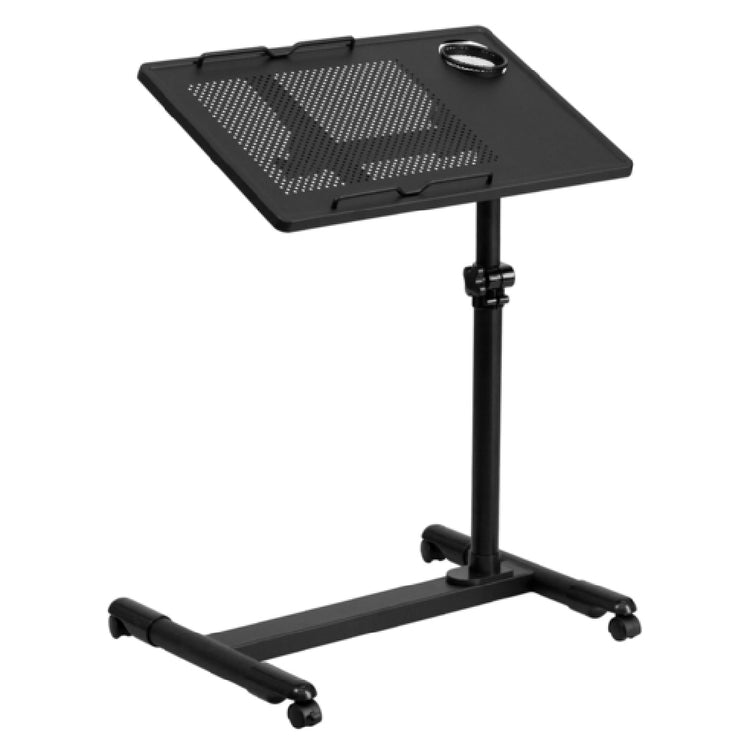 The Flash Furniture NAN-JG-06B-BK-GG Computer Desk is meticulously designed for diverse user needs, featuring a unique blend of adjustability and mobility. The desk measures 22-1/2 inches in width and 17-1/2 inches in depth, with an adjustable height range from 22 inches to 36-1/2 inches, allowing for a customizable setup tailored to individual preferences and ergonomic requirements. Its vented black laminate top, measuring 22 inches by 13-3/4 inches, provides a stable and durable workspace. The desk incorporates a tilting work surface with a 360-degree swivel capability, enhancing versatility for various tasks. Equipped with a black mesh pen/pencil/cup holder, this desk ensures that essential accessories are within easy reach. The robust black powder-coated steel frame offers structural integrity and longevity. Mobility is enhanced through four dual-wheel casters, with two locking options for stability, facilitating easy movement across different locations. The top and bottom lips are strategically designed to secure papers and documents, preventing them from sliding off. This desk requires assembly and in-stock items typically ship within 24 hours, making it a practical and efficient choice for home offices, corporate environments, educational settings, and more, catering to a wide array of professional and personal applications.