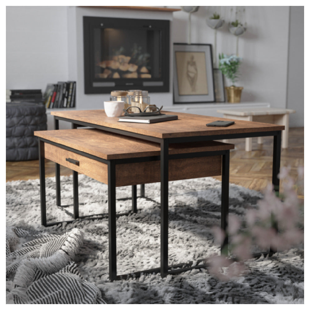 Flash Furniture NAN-JH-17145-GG Emerson 2 Piece Modern Nesting Coffee Table Set With Storage Drawer In Walnut Finish With Black Sled Base Metal Frames