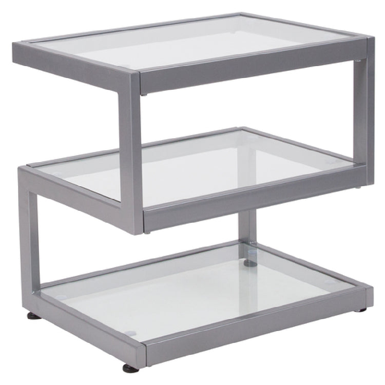 The Flash Furniture NAN-JH-1736-GG Ashmont Collection End Table is a contemporary piece designed to elevate any living space with its sleek aesthetics and functional design. Featuring a rectangular shape, this end table measures 21-1/4 inches in width, 15-3/4 inches in depth, and 21 inches in height, providing an ideal size for various room settings. The table is highlighted by a 5mm thick, clear tempered glass top, offering both durability and a modern touch. Complementing its elegant appearance is a distinctive silver powder-coated S-shaped designer steel frame, which not only adds to the table's structural integrity but also enhances its visual appeal. Additionally, the end table includes two shelves, providing ample space for storage or display of decorative items, making it a versatile addition to any home or office. Equipped with floor glides, this piece ensures easy movement and stability on various floor surfaces. The Flash Furniture NAN-JH-1736-GG Ashmont Collection End Table is typically available for quick shipping, usually within 24 hours, making it a convenient and stylish choice for those looking to update their interior decor with a practical and chic furniture solution.