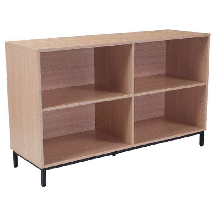 The Flash Furniture NAN-JH-1764-GG Dudley Bookshelf is a contemporary storage solution designed for diverse market segments, offering a blend of style and functionality. With overall dimensions of 47-1/4"W x 16"D x 29-1/2"H, it fits seamlessly into various spaces, from home offices to commercial settings. The bookshelf features four laminate open storage compartments, each measuring 22-3/4"W x 15-3/4"D x 11-1/2"H, providing ample space for books, decor, or office supplies. Its black powder-coated frame finish adds a sleek, modern touch, while the oak wood grain finish of the shelves introduces a natural, sophisticated element to any room. The bookshelf is equipped with adjustable floor glides, ensuring stability on uneven surfaces, making it suitable for a variety of flooring types. This product is typically in stock and ships within 24 hours, offering a quick and efficient solution to your organizational needs. The Flash Furniture Dudley Bookshelf is a versatile piece that combines practical storage capabilities with an attractive design, meeting the demands of both residential and commercial environments with ease and style.