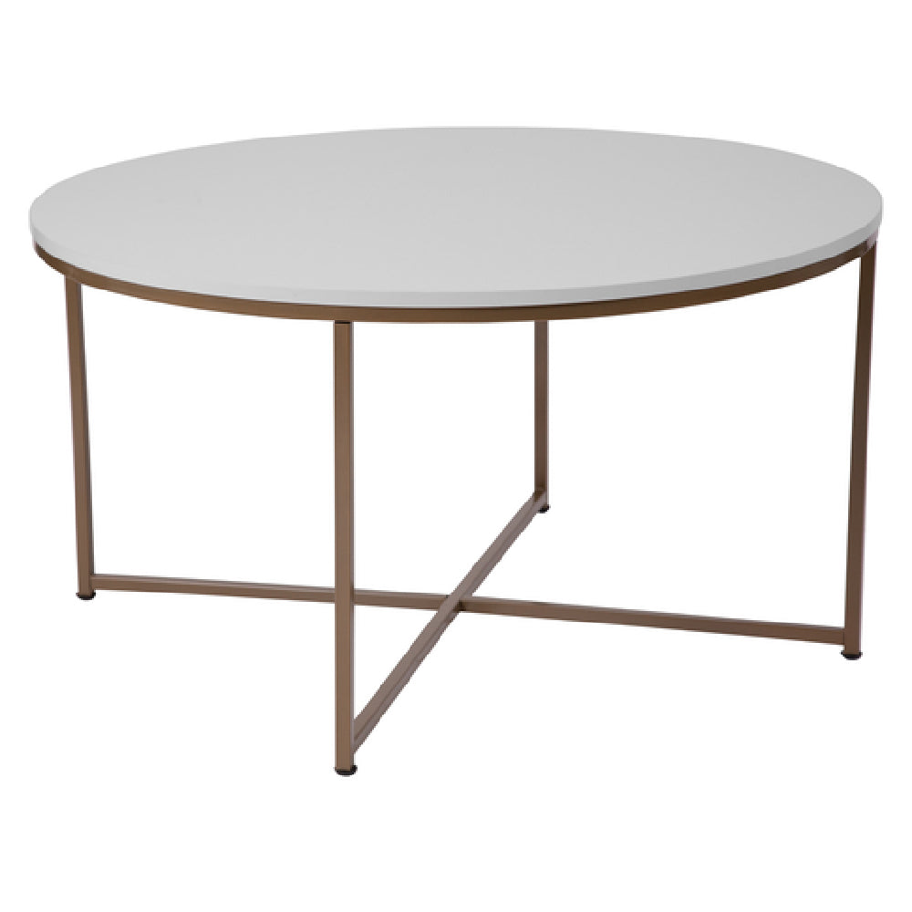 The Flash Furniture NAN-JH-1787CT-GG Hampstead Collection Coffee Table is a distinguished piece of contemporary furniture, characterized by its round design and generous dimensions of 35-1/2"W dia. x 19-1/4"H. This coffee table showcases a white laminate finish top that is both stylish and functional, with a 1/2" thick edge that adds to its robust appearance. The table's matte gold powder coated frame finish not only enhances its aesthetic appeal but also ensures durability and a sleek look. Floor glides are included, offering protection for various flooring types and facilitating easy movement. This table is an excellent choice for modern homes seeking a blend of elegance and practicality. It is designed to complement a variety of living room settings, providing both visual appeal and a reliable surface for everyday use. The Flash Furniture Hampstead Collection Coffee Table is readily available, typically shipping within 24 hours, making it a convenient option for those in need of an immediate furnishing solution. Its distinctive combination of size, finish, and design underscores its versatility and suitability for diverse market segments, from residential spaces to commercial environments that value style and functionality.