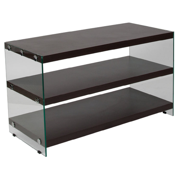 Flash Furniture NAN-JN-2626TR-G-GG Wynwood Collection TV Stand 39-1/2"W X 17-3/4"D X 23"H Overall is a contemporary piece designed for modern living spaces. This TV stand accommodates flat panel TVs up to 40 inches, making it suitable for various home entertainment setups. With dimensions of 39-1/2" width, 17-3/4" depth, and 23" height, it offers a compact yet functional solution for living rooms, bedrooms, or offices. The rectangular laminate top provides a durable surface, while the dark ash wood grain finish adds a touch of elegance to any décor. The stand features two laminate shelves, each with an 8-inch space between them, perfect for organizing media components or decorative items. Its glass frame enhances the visual appeal, creating a modern aesthetic that complements its surroundings. Floor glides ensure stability and protect flooring surfaces from scratches. Typically shipping within 24 hours from stock, this TV stand is a practical choice for those seeking efficient delivery and assembly. The Flash Furniture NAN-JN-2626TR-G-GG TV stand represents a harmonious blend of functionality and style, catering to a diverse audience ranging from home users to interior designers looking for sleek, space-efficient furniture solutions.