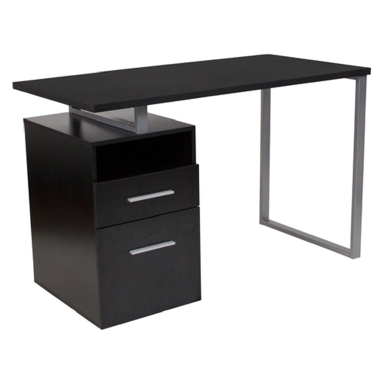 The Flash Furniture NAN-JN-2634-G-GG Harwood Computer Desk is a contemporary piece designed for efficient workspace management. Measuring 47 inches in width, 23-1/2 inches in depth, and 30-1/2 inches in height, this desk is an ideal choice for both home and office environments. The desk features a laminate top that ensures durability and a sophisticated dark ash woodgrain finish that enhances its aesthetic appeal. It includes a black pedestal with dimensions of 15-3/4 inches in width, 19-1/2 inches in depth, and 25-1/2 inches in height, providing ample support and stability. For storage, the desk is equipped with a 12-1/4 inch by 19 inch by 4-1/2 inch open storage space, a 12-1/4 inch by 13 inch by 4-1/2 inch box drawer, and a 12-1/4 inch by 13 inch by 10 inch file drawer. These compartments offer convenient options for organizing office supplies and documents. The desk's structure is complemented by a silver powder-coated steel frame, adding a sleek, modern touch while ensuring robust support. Typically shipping within 24 hours, this desk is a versatile solution for professionals seeking functionality blended with style in their workspace.