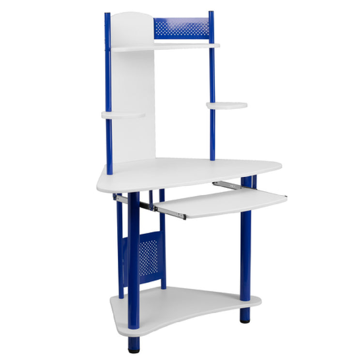 The Flash Furniture NAN-JN-2705-BL-GG Computer Desk with Hutch is a meticulously designed workstation, ideal for various market segments ranging from home offices to professional environments. This desk measures 39"W x 24"D x 57"H, offering a compact yet efficient workspace. It features a top shelf with a side guard and a bottom shelf, providing ample storage for office essentials. The desk is equipped with two dedicated speaker shelves, contributing to a well-organized and streamlined setup. A sliding keyboard tray, measuring 21-3/4"D x 11-3/4"D, adds functionality without compromising on space. With a white laminate finish, the desk is not only aesthetically pleasing but also durable. The blue powder-coated metal frame adds a touch of modernity and robustness, ensuring long-term stability. Floor glides are included, enhancing stability and protecting floor surfaces from scratches. Assembly is required, yet the product is designed for straightforward construction. Typically, in-stock items ship within 24 hours, ensuring prompt delivery. This desk’s unique combination of storage solutions, durable design, and aesthetic appeal positions it as a valuable asset for those seeking an efficient and stylish workspace solution.
