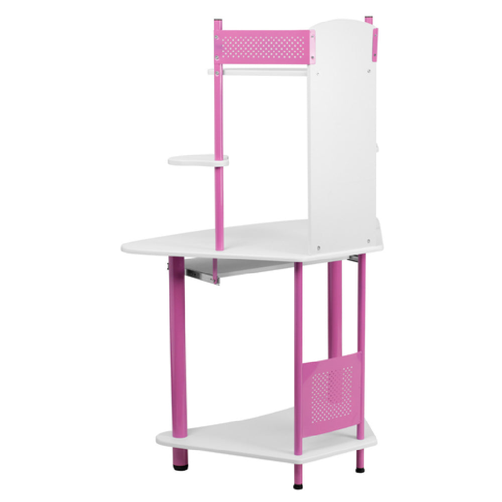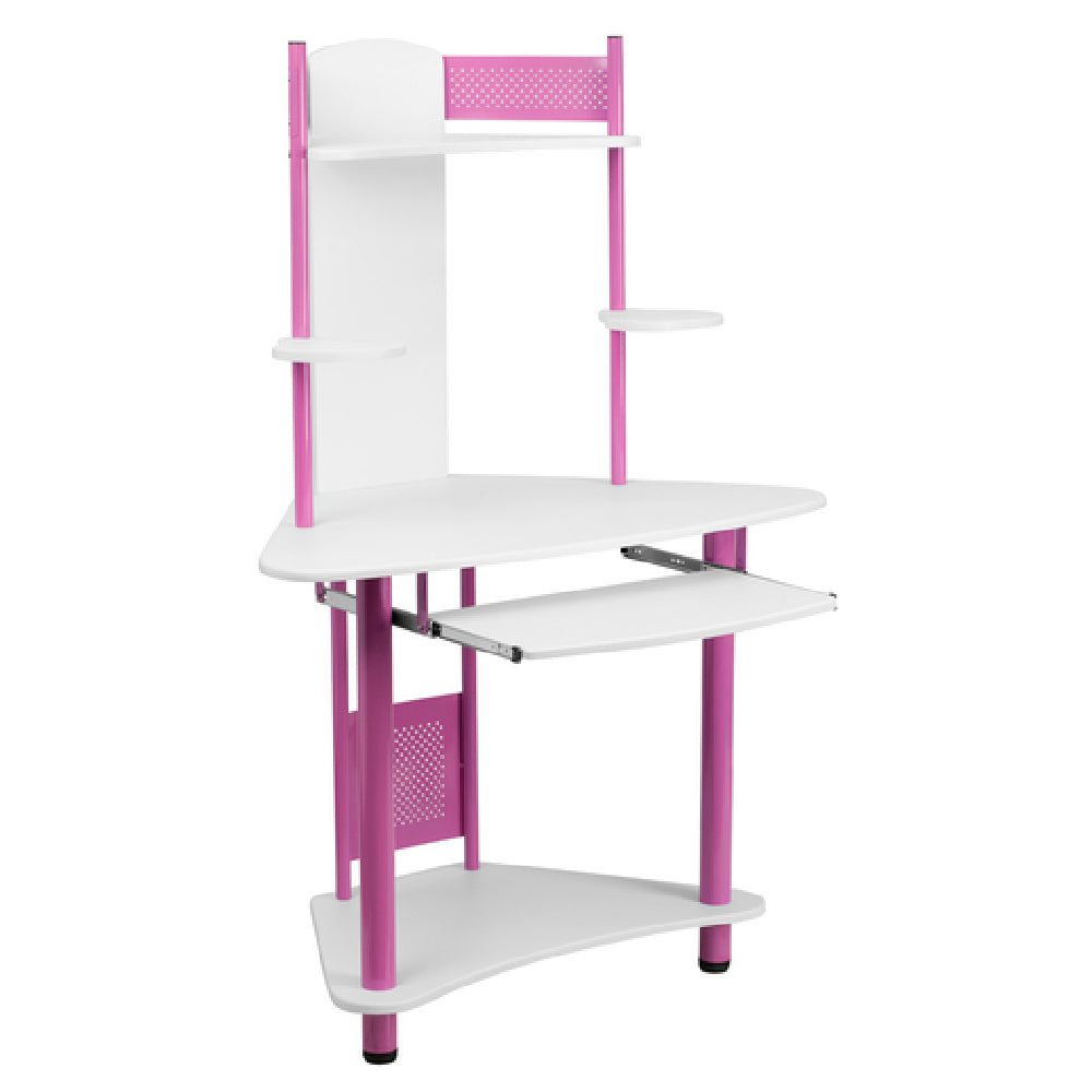 The Flash Furniture NAN-JN-2705-PK-GG Computer Desk With Hutch 39"W x 24"D x 57"H is a versatile workstation designed to meet the needs of various market segments, from home offices to educational environments. This compact desk features a white laminate finish and a pink powder-coated metal frame, offering a stylish yet functional aesthetic. The desk is equipped with a top shelf secured by side guards, providing additional storage space for books or decorative items. A bottom shelf adds further utility, while two dedicated speaker shelves cater to multimedia needs. The sliding keyboard tray measures 21-3/4"D x 11-3/4"D, accommodating standard keyboards and enhancing user comfort. Floor glides allow for easy movement and positioning on various surfaces, ensuring stability. The desk requires assembly, and in-stock items typically ship within 24 hours, making it a convenient choice for those seeking prompt delivery. This computer desk's thoughtful design and durable construction make it an attractive option for individuals seeking functionality and style, particularly in spaces where efficient use of space is crucial. It seamlessly combines practical features with a modern design, catering to diverse user requirements.