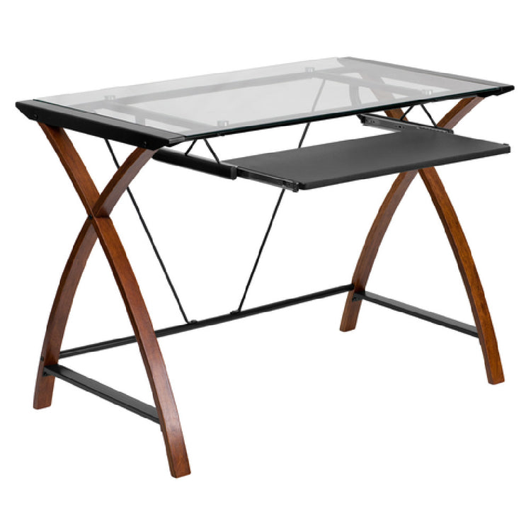 Flash Furniture NAN-JN-2824S-GG Computer Desk is a meticulously designed workspace solution, featuring a clear tempered glass top with dimensions of 39-1/4"W x 23-1/2"D x 29"H. This desk is equipped with a 23-1/2"W x 11-3/4"D sliding keyboard tray, enhancing its functionality and user comfort. It is supported by crisscross cherry-finished legs, which add an elegant aesthetic while ensuring stability. The black powder-coated metal frame provides a robust structure, resistant to wear and tear. Floor glides are included, ensuring smooth movement and protection for various floor types. This desk requires assembly upon delivery, and in-stock items are typically dispatched within 24 hours. The Flash Furniture NAN-JN-2824S-GG Computer Desk is an ideal choice for home offices, corporate settings, or student dorms, offering a versatile and stylish solution to meet diverse workspace needs. Its compact dimensions make it suitable for smaller spaces while maintaining a contemporary look. The combination of glass, metal, and wood elements highlights a modern design that can complement various interior styles. This desk provides a unique value proposition by balancing aesthetic appeal and practical features, catering to a wide range of market segments within the office furniture industry.