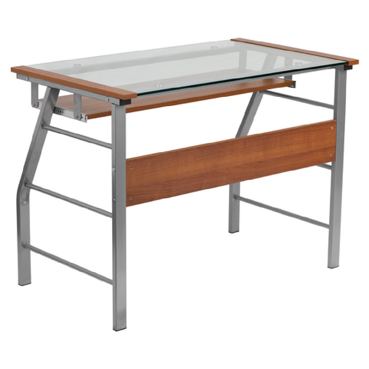 The Flash Furniture NAN-JN-2940-GG Computer Desk is a versatile workspace solution designed to accommodate various needs within professional and personal environments. Measuring 39-3/8 inches in width, 23-1/26 inches in depth, and 29-1/2 inches in height, this desk provides ample space for computing tasks. The highlight of this model is its elegant clear tempered glass top, which enhances the aesthetic appeal while providing durability. The desk includes a 35-inch wide by 11-1/2-inch deep sliding keyboard tray, offering functional convenience for users who require an organized workspace. Additionally, it features a cherry laminate finish that complements its sophisticated design, along with a privacy panel for added discretion. The desk is supported by a silver powder-coated metal frame with beveled front legs, ensuring stability and a modern look. Plastic floor glides protect flooring surfaces and facilitate smooth movement. Though assembly is required, the straightforward design allows for quick setup. Most in-stock items ship within 24 hours, offering prompt availability. This desk is ideal for home offices, corporate settings, and creative studios, providing a blend of style, functionality, and efficiency.