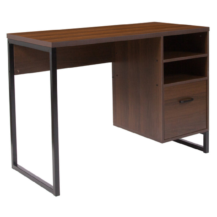The Flash Furniture NAN-NJ-HD10168-GG Northbrook Computer Desk is a versatile workspace solution featuring a rustic design and practical storage options, making it suitable for various market segments such as home offices and small business environments. Measuring 41-1/4 inches in width, 19-1/2 inches in depth, and 29-1/2 inches in height, this desk provides ample surface area for computer equipment and work materials. The desk's laminate top is enhanced by a coffee wood grain finish, creating an aesthetically pleasing and durable work surface. It includes two open storage shelves, each measuring 13-1/4 inches in width, 18 inches in depth, and 5 inches in height, offering easy access to frequently used items. Additionally, the desk features a single drawer measuring 11 inches in width, 13 inches in depth, and 10-1/2 inches in height, ideal for storing essential office supplies. The sturdy black powder-coated metal frame ensures stability, while floor glides protect your flooring from scratches and enable smooth movement. Typically shipped within 24 hours, this desk is designed to meet the needs of individuals seeking a functional yet stylish computer desk solution that complements their existing decor and workspace requirements.
