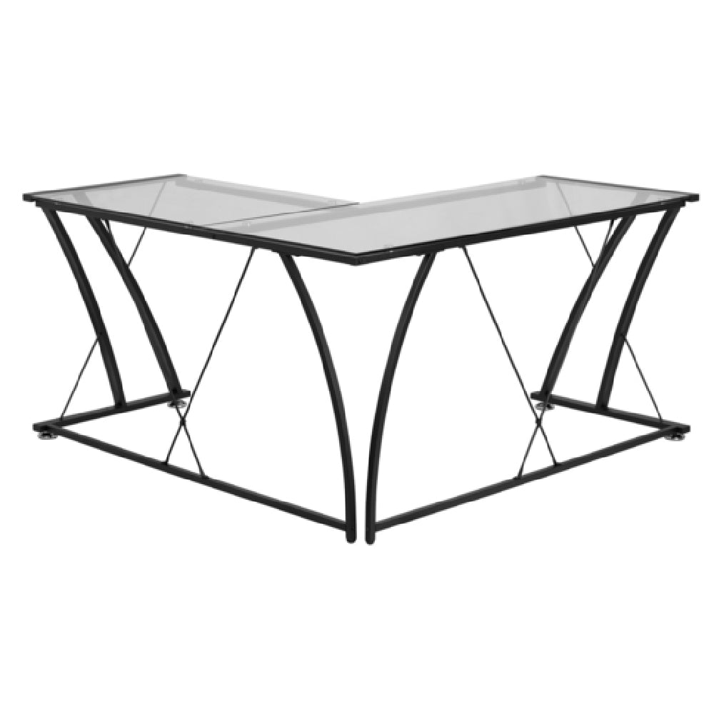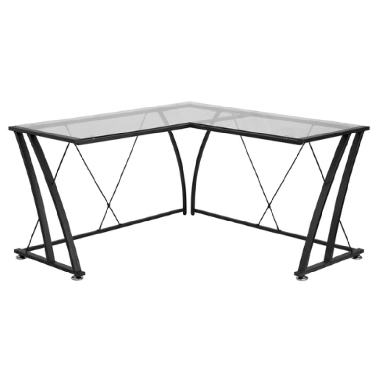 The Flash Furniture NAN-WK-096-GG L-Shape Computer Desk is a highly functional and spacious workstation designed for both home and office environments. With an overall dimension of 79 inches wide by 56 inches deep by 29-3/4 inches high, this desk provides ample space for multitasking and organizing your workspace efficiently. It features two clear tempered glass top desks, each measuring 56 inches wide by 23-1/2 inches deep by 29-3/4 inches high, offering a sleek and modern aesthetic that complements any decor. The desk is supported by a sturdy black powder-coated metal frame, ensuring durability and stability for long-term use. Additionally, the self-leveling floor glides contribute to a stable setup on uneven surfaces. This versatility makes it an appealing choice for different market segments, from corporate offices to home studios, where space optimization and a contemporary look are valued. Assembly is required, and in-stock items typically ship within 24 hours, allowing for quick setup and integration into your workspace. The Flash Furniture NAN-WK-096-GG L-Shape Computer Desk combines style, functionality, and practicality, making it a standout addition to your professional or personal environment.