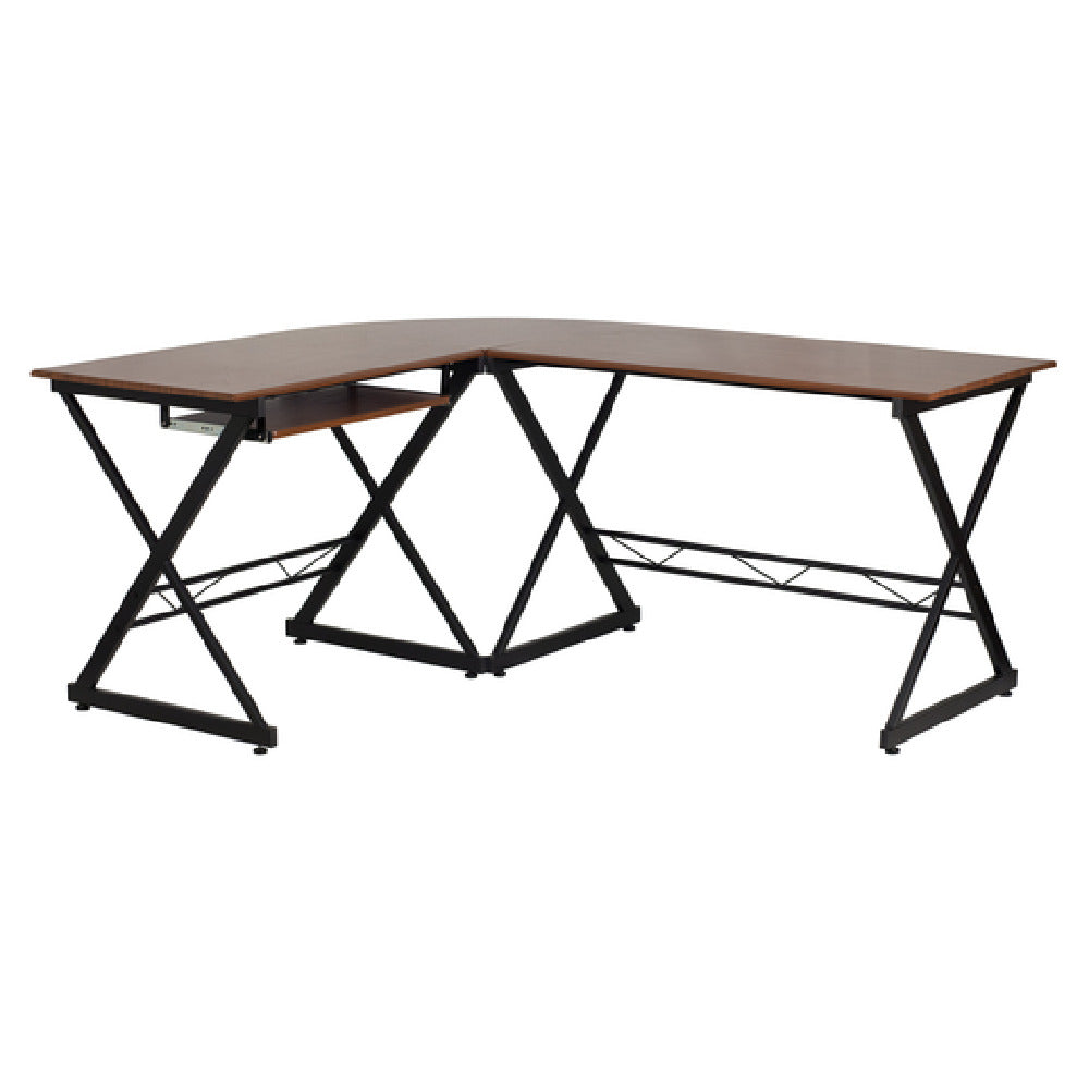 The Flash Furniture NAN-WK-109-GG L-Shape Computer Desk is an expertly designed workspace solution measuring 87"W x 50"D x 29-3/4"H overall. This desk comprises two teakwood laminate finish top sections, one measuring 31-1/2"W x 23-1/2"D x 29-3/4"H, and the other 43-1/4"W x 23-1/2"D x 29-3/4"H. A 33-1/4"W corner connector provides a seamless transition between these two sections, creating a functional L-shape ideal for office environments and home workspaces. The desk also includes a 23-1/2"W x 11-1/2"D x 26-1/4"D sliding keyboard tray, enhancing ergonomic comfort. Structurally, the desk features a black powder-coated metal frame with floor glides, ensuring stability and preventing floor damage. Assembly is required, but items in stock typically ship within 24 hours, ensuring a swift delivery process. This desk's versatile design caters to various market segments, providing ample space for multitasking professionals, students needing a spacious study area, or creatives requiring a large surface for projects. The combination of durable materials and thoughtful design makes the Flash Furniture NAN-WK-109-GG L-Shape Computer Desk a practical and stylish choice for diverse workspace needs.