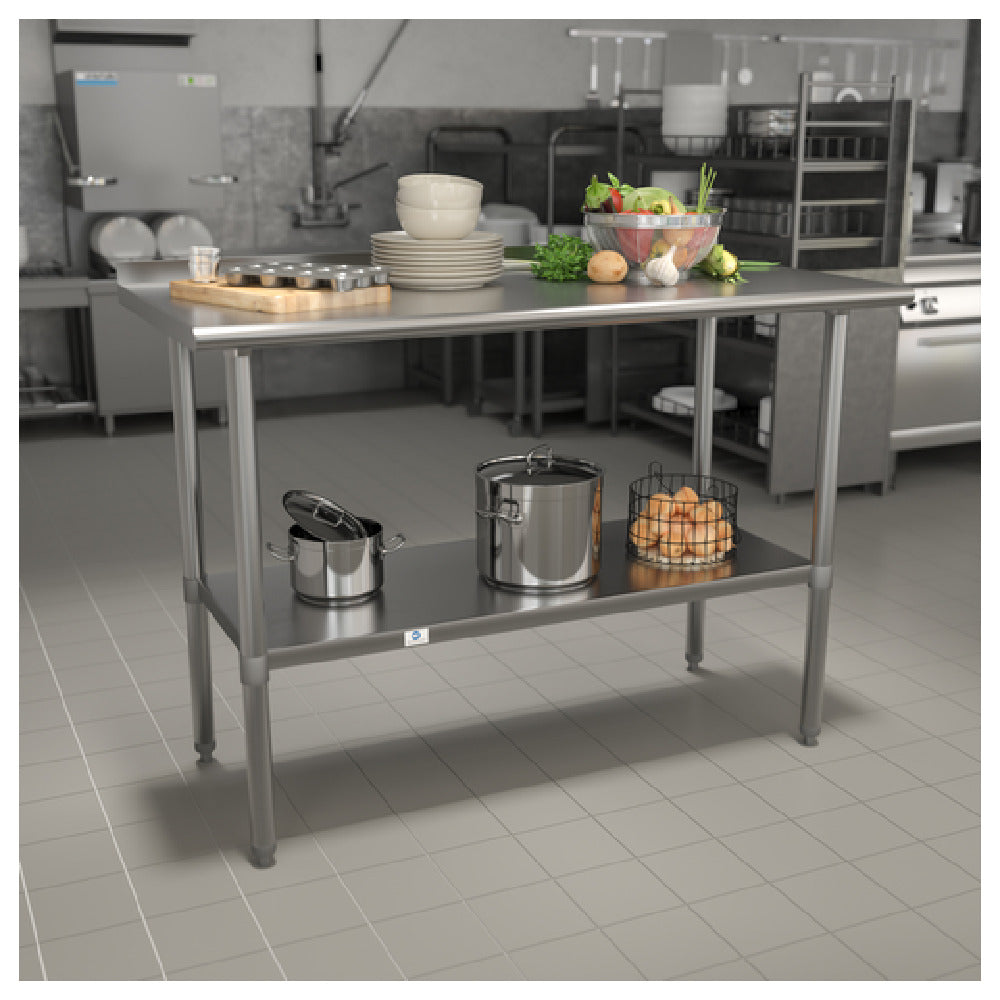 The Flash Furniture NH-WT-2448BSP-GG Prep And Work Table is meticulously crafted for professional settings requiring robust and hygienic work surfaces. Measuring 48 inches in width, 24 inches in depth, and 36 inches in height, this table is engineered with an 18-gauge stainless steel top, ensuring durability and resistance to corrosion. The 1.5-inch backsplash is a practical feature, designed to prevent spills and maintain cleanliness, making it particularly suitable for culinary and laboratory environments. An additional undershelf provides convenient storage, optimizing workspace organization and accessibility. Certified by NSF, this table meets strict public health and safety standards, affirming its suitability for food service applications. Its stainless steel construction not only ensures longevity but also facilitates easy cleaning, essential for maintaining strict hygiene protocols. The versatile dimensions and sturdy build make this prep and work table an ideal choice for a variety of settings including commercial kitchens, food preparation areas, and industrial workspaces, where reliability and efficiency are paramount. This table is a testament to quality design, offering seamless integration into diverse professional environments that demand both functionality and adherence to safety standards.