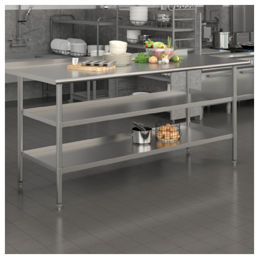 The Flash Furniture NH-WT-GU-3072BSP-GG Ravenel Stainless Steel 18 Gauge Work Table with 1.5" Backsplash and 2 Undershelves - 72"W x 30"D x 34.5"H is meticulously crafted to serve the diverse needs of professionals across various industries. Constructed from 18 gauge stainless steel, this work table is designed for durability and resilience, ensuring long-term use in demanding environments. Its 72" width and 30" depth provide ample workspace, accommodating a wide range of tasks and applications. The 1.5" backsplash is an essential feature that helps maintain cleanliness by preventing spills and debris from falling behind the table, thus promoting efficient hygiene practices. Additionally, the inclusion of two undershelves offers substantial storage space for equipment and supplies, optimizing organization and accessibility within the workspace. Standing at a height of 34.5", the table is ergonomically designed for comfortable use. The NSF certification guarantees that this work table meets strict standards for public health protection, making it a reliable choice for commercial kitchens, laboratories, and other professional settings looking to uphold high hygiene and safety standards. The Flash Furniture Ravenel Stainless Steel Work Table exemplifies a perfect blend of functionality, efficiency, and robustness to meet the unique requirements of various market segments.