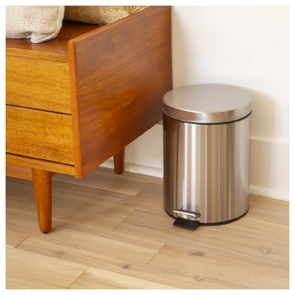 Flash Furniture PF-H008A5-M-GG Round Stainless Steel Fingerprint Resistant Soft Close Step Trash Can - 1.3 Gallons (5L) is a meticulously engineered waste management solution designed for both residential and commercial use. It features a round stainless steel body that is resistant to fingerprints, ensuring a clean and sleek appearance with minimal maintenance. The soft-close mechanism of the trash can lid prevents slamming, offering a quieter and more seamless operation, which is particularly beneficial in environments where noise reduction is valued. With a capacity of 1.3 gallons (5L), this trash can is ideal for small spaces such as offices, bathrooms, or compact kitchens, providing efficient waste disposal without occupying excessive space. The model reference PF-H008A5-M-GG ensures easy identification and procurement for businesses looking to maintain consistency in their facilities. This trash can emphasizes durability, aesthetic appeal, and practical functionality, catering to diverse market segments that prioritize both form and function in waste management solutions. Its distinct fingerprint-resistant feature sets it apart from traditional trash cans, making it a preferred choice for those seeking a low-maintenance, elegant, and efficient waste disposal option in various settings.