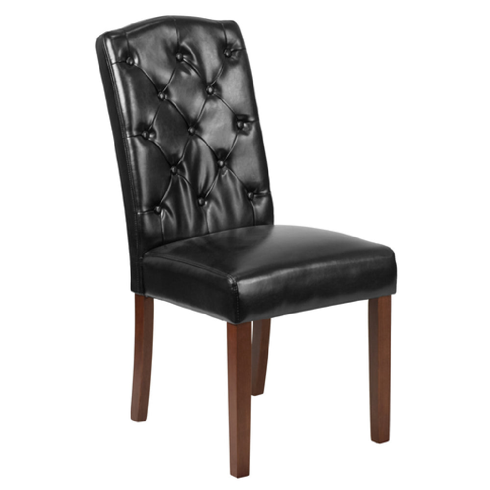 The Flash Furniture QY-A18-9325-BK-GG Hercules Grove Park Series Parsons Side Chair showcases a mid-century design that seamlessly blends style with functionality. This chair features an upholstered button-tufted back and a comfortable upholstered seat, both of which are padded with high-density foam for enhanced comfort. The foam used is CA117 fire retardant, ensuring safety in residential environments. Supporting the chair are mahogany wood finished legs, which add a touch of elegance and stability to the design. Additionally, the chair comes equipped with plastic floor glides to protect your flooring from scratches, making it ideal for home use. The chair is upholstered in black LeatherSoft, a material that combines both leather and polyurethane for added durability and a softer feel. Notably, the chair is designed exclusively for residential use and is readily available, usually shipping within 24 hours. This makes it a practical choice for those seeking a stylish and comfortable seating solution for their living spaces. The Hercules Grove Park Series Parsons Side Chair stands out in the market for its compelling combination of design, comfort, and safety features tailored to residential needs.