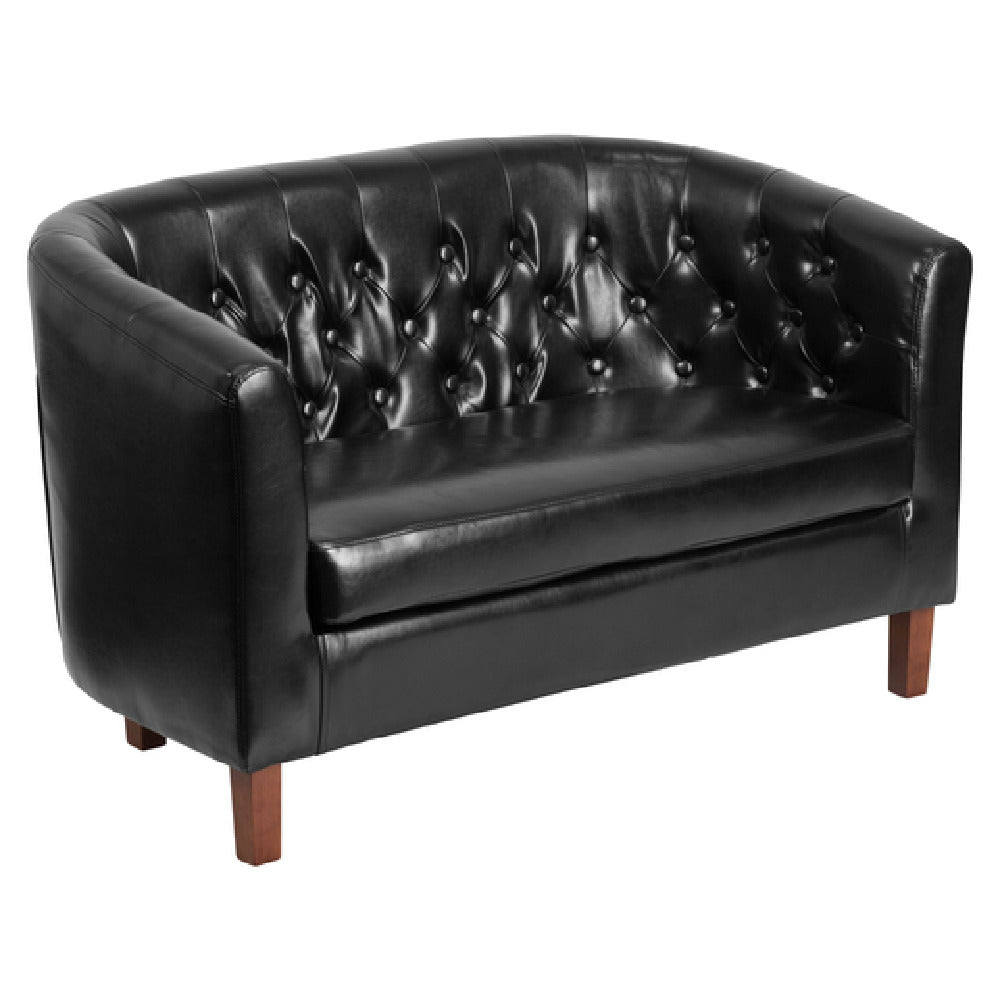 The Flash Furniture QY-B16-2-HY-9030-8-BK-GG Hercules Colindale Series Loveseat is a meticulously crafted seating solution, measuring 49-1/2"W x 28"D x 30"H, perfectly suited for various settings including residential living rooms, professional offices, and hospitality environments. It features a traditional design with an upholstered button-tufted back and slanted arms that exude classic elegance. The loveseat is fitted with an upholstered loose seat cushion, ensuring comfort and adaptability. Its construction incorporates CA117 fire retardant foam, enhancing safety and durability. The no sag sinuous springs provide lasting support, preventing seat deformation over time. The loveseat sits on mahogany wood feet, offering both stability and a touch of sophistication, while plastic floor glides protect flooring surfaces from scratches. The black bottom dust cover maintains the loveseat’s pristine condition by guarding against dust accumulation. Upholstered in black LeatherSoft, a blend of leather and polyurethane, the piece combines softness with the durability needed for high-use areas. This loveseat, usually shipping within 24 hours when in stock, stands out in the market for its blend of style, comfort, and safety, making it a versatile and reliable choice for different market segments within the furniture industry.