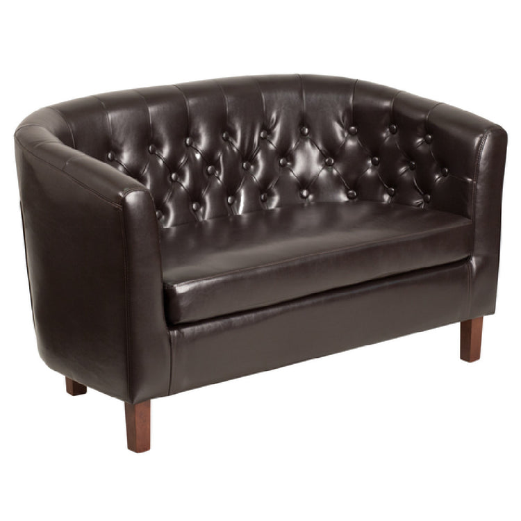 The Flash Furniture QY-B16-2-HY-9030-8-BN-GG Hercules Colindale Series Loveseat - 49-1/2"W x 28"D x 30"H - embodies a classic aesthetic with its traditional design, ideal for diverse markets such as residential living spaces and commercial environments like waiting areas or hospitality settings. The loveseat features an upholstered button-tufted back and slanted arms, providing both comfort and elegance. Its upholstered loose seat cushion is crafted with CA117 fire retardant foam, ensuring safety and durability. Designed with no sag sinuous springs, it offers long-lasting support and comfort. A black bottom dust cover protects the loveseat's underside, enhancing its longevity. The piece is elevated by mahogany wood feet, which add a touch of sophistication, and equipped with plastic floor glides to prevent floor damage, making it a practical choice for high-traffic areas. Upholstered in brown LeatherSoft, a blend of leather and polyurethane, it combines the feel of leather with added softness and durability. Typically in stock and shipping within 24 hours, this loveseat is a convenient and stylish option for those seeking to enhance their space with quality seating. This finely tailored piece balances timeless design with functional features, meeting the varied needs of modern interiors.