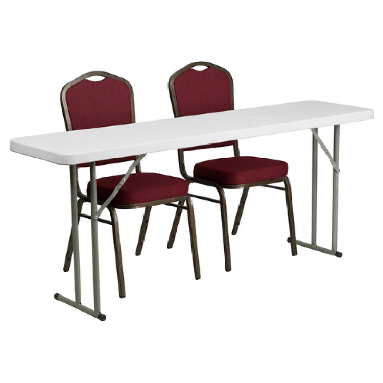 The Flash Furniture RB-1872-1-GG Folding Training Table and Chair Set includes a versatile folding table and stacking banquet chairs, ideal for educational settings, conference rooms, and training facilities. The folding table measures 72"W x 18"D x 29"H, featuring a 1-3/4" thick granite white plastic tabletop with a 220 lb. static load capacity. Its gray powder-coated metal locking legs and protective floor caps ensure stability and protect flooring surfaces. This table is designed to withstand demanding environments with its waterproof, impact, and stain-resistant top. Accompanying the table are two stacking banquet chairs measuring 17-1/4"W x 20-1/4"D x 36-1/2"H, each boasting a 500 lb. weight capacity. The chairs feature a crown design seamless back panel and burgundy fabric upholstery that adds a touch of elegance. Comfort is enhanced with 2-1/2" thick CA117 fire retardant foam seats and double support braces. Constructed with a 16-gauge steel frame, the chairs are finished with a gold vein powder coating and have plastic floor glides for added protection. Designed for commercial use, this set offers durability and convenience, shipping fully assembled in two boxes. In-stock items typically ship within 24 hours, streamlining the procurement process for businesses.