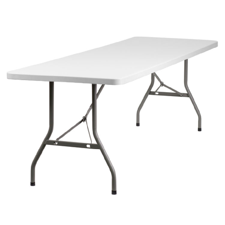 The Flash Furniture RB-3096-GG Folding Table is a versatile and durable solution for both indoor and outdoor settings, measuring 96"W x 30"D x 29"H and capable of seating up to 10 adults comfortably. This rectangular table features a 2-inch thick granite white plastic tabletop, offering a substantial 661 lb. static load capacity, ideal for hosting various events and meetings. The table's design includes gray powder-coated metal locking legs that provide stability and strength while in use. Protective floor caps are integrated to prevent damage to floors, ensuring compatibility with a range of environments. The table's top is waterproof, impact-resistant, and stain-resistant, making it a reliable choice for enduring the rigors of regular use. Its construction facilitates easy maintenance and longevity, catering to different market segments such as event planning, hospitality, and educational institutions. Notably, the RB-3096-GG's lightweight and foldable design allows for effortless transport and storage, enhancing its appeal for businesses and organizations that require flexible furniture arrangements. This product is designed to meet the demands of high-traffic areas while providing a functional and aesthetically pleasing addition to any space. In-stock items are typically dispatched within 24 hours, ensuring prompt delivery and convenience for users.