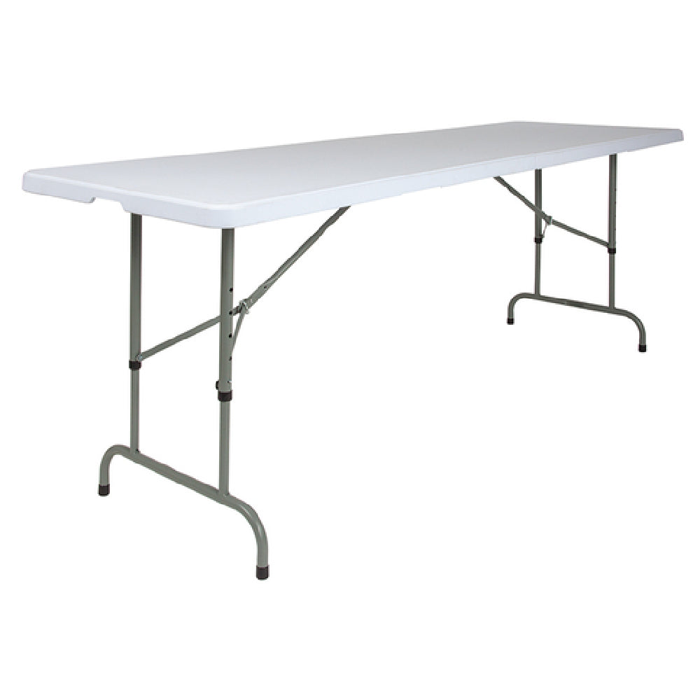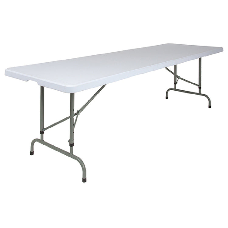 The Flash Furniture RB-3096ADJ-GG Ready To Use Commercial Table is an 8-foot folding table that expertly combines functionality with durability, capable of seating up to 10 adults comfortably. This table is built to withstand a static load capacity of 661 pounds, making it a robust choice for various settings. The 1-inch thick granite white tabletop is both waterproof and resistant to impact and stains, ensuring longevity and ease of maintenance. Its accommodating adjustable height frame allows for versatile use, catering to different needs in both indoor and outdoor environments. The gray powder-coated locking legs provide stability and safety during use, while the protective floor caps prevent damage to flooring surfaces. Designed with versatility in mind, this table is perfect for commercial spaces, event venues, and even home use, offering a reliable solution for a wide range of applications. With its thoughtful construction and attention to detail, the Flash Furniture RB-3096ADJ-GG table stands out as a valuable asset in any setting, providing practical and efficient seating and workspace solutions.