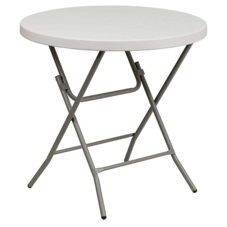 The Flash Furniture RB-32R-GW-GG Folding Table 31-1/2" Dia. x 30-1/4"H is a versatile and compact solution for various seating needs, accommodating up to three adults. This round table features a 1-3/4" thick granite white plastic tabletop that is both waterproof and resistant to impacts and stains, making it suitable for both indoor and outdoor environments. Its robust design supports a static load capacity of 220 lbs, ensuring durability for different uses. The table is supported by gray powder-coated metal cross legs that provide stability and protection, thanks to the inclusion of protective floor caps. Known for its quick shipping, with in-stock items typically dispatched within 24 hours, this folding table meets the needs of different market segments, from event planners requiring portable furniture to homeowners seeking versatile dining solutions. Its practical design is ideal for garden parties, commercial events, or impromptu gatherings, providing reliable utility without compromising aesthetics or functionality.