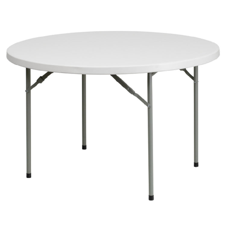 The Flash Furniture RB-48R-GG Folding Table is uniquely crafted for flexibility and durability, featuring a 48-inch diameter by 29-inch height, accommodating up to 5-6 adults comfortably. This round folding table boasts a 500-pound static load capacity, making it a robust choice for various settings. The table is engineered with a 1-3/4-inch thick granite white plastic table top, which is both impact and stain resistant, ensuring a long-lasting, clean appearance. Its waterproof surface is ideal for indoor and outdoor use, adding versatility to its design. The table's gray powder-coated metal locking legs provide stable support and durability, while the protective floor caps prevent damage to flooring. This folding table is a practical solution for both residential and commercial environments, adapting seamlessly to events, meetings, or casual gatherings. The combination of its lightweight structure and sturdy construction makes it easy to set up and store, offering convenience without sacrificing strength. With the promise of quick shipping on in-stock items, the Flash Furniture RB-48R-GG Folding Table meets the demand for quality and efficiency in the furniture industry, catering to a wide range of practical applications.