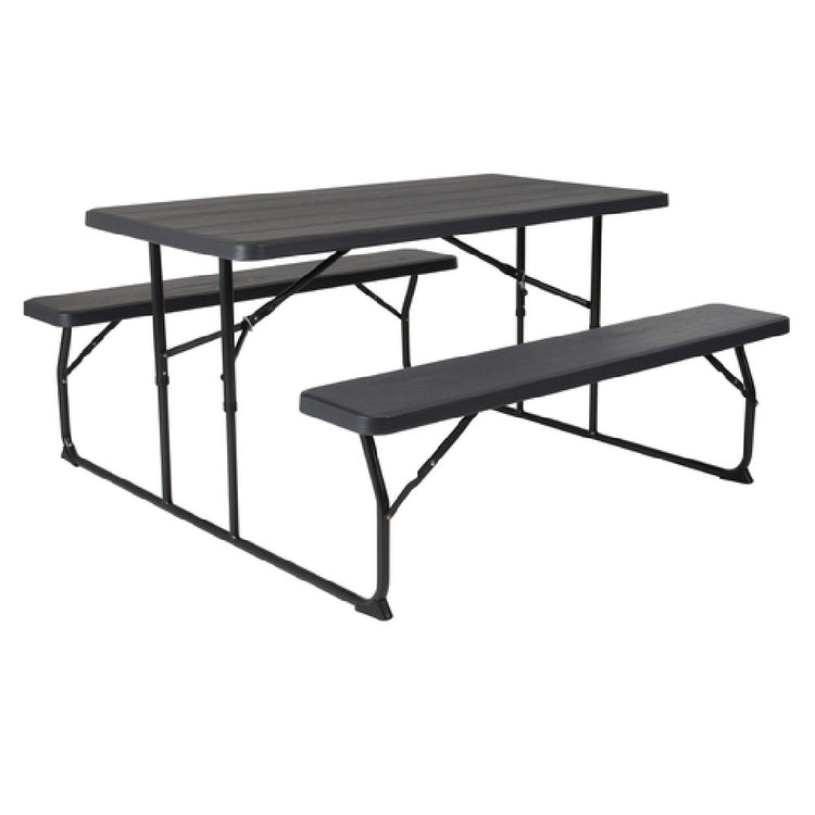 The Flash Furniture RB-EBB-1470FD-GG Insta-Fold Folding Picnic Table & Benches is a versatile outdoor solution designed to accommodate various needs across different market segments. Featuring a generous dimension of 53-3/4" width by 58-1/4" depth by 28-1/4" height, this table and bench set can comfortably seat up to four individuals. With an impressive weight capacity of 661 lbs., it is suitable for both residential and commercial use, providing robust support and durability. The stain-resistant and waterproof black wood grain plastic surface ensures longevity and easy maintenance, making it ideal for outdoor events and gatherings. Supported by a sturdy steel frame with black steel powder-coated legs, it offers enhanced stability and resistance to the elements. The anti-skid glides ensure that the set remains securely in place during use, enhancing safety on various surfaces. One of its most convenient features is that no assembly is required, allowing for immediate use upon delivery. This product is particularly appealing for event organizers, outdoor spaces in hospitality, and families who prioritize convenience and durability in outdoor furniture. Its practical design and quality construction make it a valuable addition to any setting requiring reliable and stylish seating options.