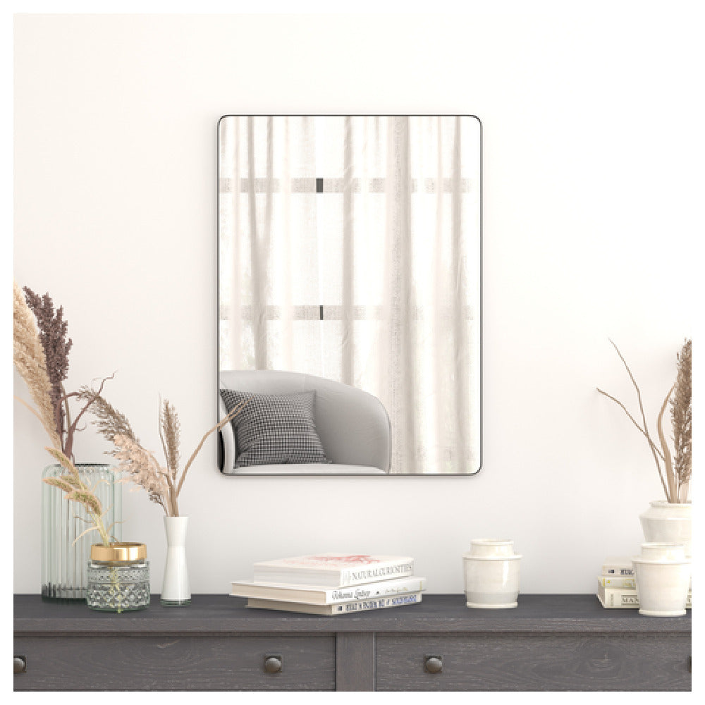 The Flash Furniture RH-M001-SRC5676MB-BK-GG Wall Mirror is a 22 x 30 inch rectangular mirror, distinguished by its sleek design and functionality, catering to a wide range of aesthetic and practical needs in both residential and commercial settings. This mirror features rounded corners that add a touch of modern elegance, making it suitable for contemporary interior designs. The aluminum frame upholstery offers a sturdy and lightweight structure, ensuring durability while maintaining a refined appearance. Equipped with a 4mm thick silver-backed glass, this mirror provides a clear and crisp reflection, enhancing the visual space and light within any room. The versatility of the Flash Furniture mirror is further highlighted by its horizontal and vertical hanging capabilities, allowing it to seamlessly fit various spaces and orientations. Whether for a hotel lobby, a bathroom, or a hallway, this wall mirror combines style with practicality, meeting the unique demands of different segment markets within the interior design industry. Its thoughtful design and quality construction make it a valuable addition to any decor, providing both aesthetic appeal and functional benefits.