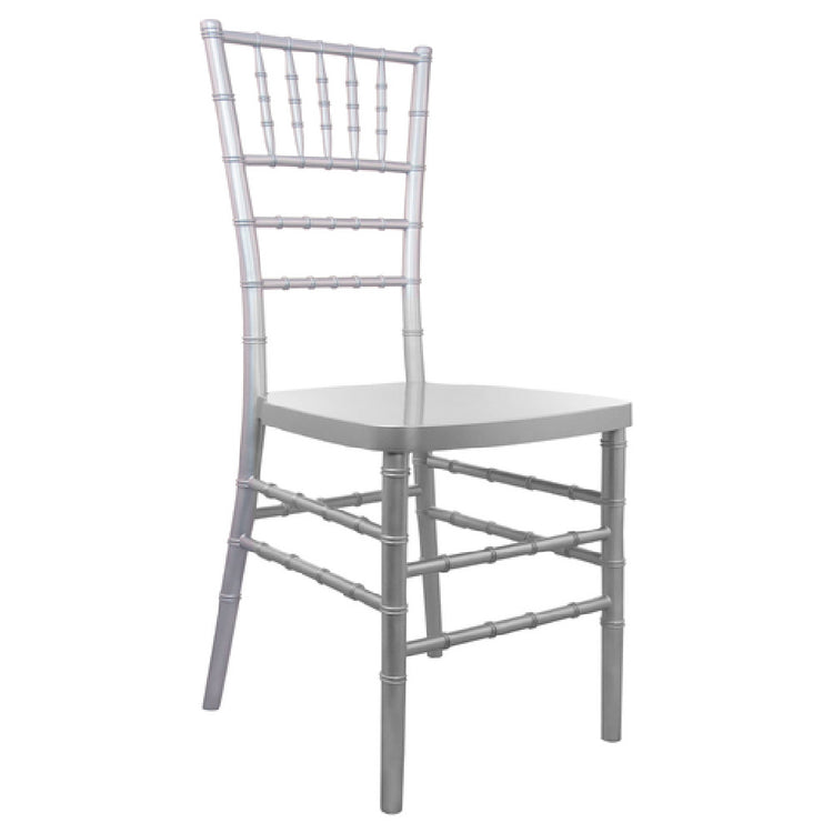 The Flash Furniture RSCHI-S Advantage Chiavari Chair is a non-upholstered seating solution crafted from resilient resin material, presented in a sleek silver finish. This chair's construction material offers a lightweight yet durable option, making it suitable for a variety of settings ranging from elegant dining venues to large event spaces. The resin composition ensures the chair's resistance to chipping and fading, promising longevity in both indoor and outdoor environments. Its design, free from upholstery, facilitates easy maintenance and cleaning, appealing to venues needing quick turnaround times between events. The Chiavari style, known for its classic and timeless aesthetic, complements various decor themes, enhancing the ambiance of formal events such as weddings, banquets, and galas. This chair is also stackable, optimizing storage efficiency, a crucial feature for event planners and venue operators managing large inventories. With attention to both form and function, the Flash Furniture RSCHI-S Advantage Chiavari Chair delivers a versatile seating option that supports a wide array of event configurations while promising durability and ease of use in high-traffic environments. Its adaptability and low-maintenance design make it an ideal choice for professionals in the hospitality and events industry seeking reliable and stylish seating solutions.