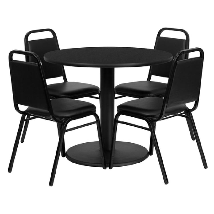 The Flash Furniture RSRB1001-GG Table and Banquet Chair Set is a comprehensive solution tailored for both commercial and residential environments. This meticulously designed set includes a 36-inch diameter table standing 30 inches high, featuring a black T-mold edge and a durable MDF core with high-impact melamine. Its black laminate finish is supported by a sturdy cast iron round base, also highlighted by a black powder-coated finish. Accompanying the table are four expertly crafted banquet chairs, each with dimensions of 17-1/2 inches in width, 20-1/4 inches in depth, and 34 inches in height. These chairs can support up to 500 pounds and are constructed with a trapezoidal seamless back panel, vinyl upholstery on the seat and back, and a 1-1/2 inch thick CA117 fire retardant foam for added safety. The chairs' design incorporates double support braces and plastic bumper guards to ensure longevity. Constructed with a robust 16-gauge steel frame, each chair has a black powder-coated finish and plastic floor glides to protect surfaces. This set requires assembly and is shipped in four boxes, with a lead time of 1-2 business days, making it a practical and efficient choice for various seating needs.