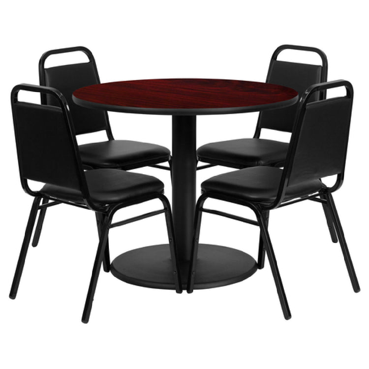 The Flash Furniture RSRB1002-GG Table and Banquet Chair Set is a versatile furniture solution designed for both commercial and residential settings. This set includes a round table measuring 36 inches in diameter and 30 inches in height, featuring a black T-mold edge and a durable MDF core with a high-impact melamine core. The table's mahogany laminate finish adds a touch of elegance, while its cast iron round base with a black powder-coated finish ensures stability. Accompanying the table are four banquet chairs, each with dimensions of 17-1/2 inches in width, 20-1/4 inches in depth, and 34 inches in height. These chairs boast a significant weight capacity of 500 pounds and feature a trapezoidal seamless back panel for added comfort. The vinyl upholstered seats and backs are supported by 1-1/2 inch thick CA117 fire retardant foam, enhancing safety. Double support braces and plastic bumper guards provide additional durability, while the 16-gauge steel frame with a black powder-coated finish ensures long-lasting use. Plastic floor glides protect flooring surfaces, making this set suitable for various environments. Assembly is required, and the set is shipped in four boxes, with a lead time of 1-2 business days, ensuring quick delivery for any urgent furnishing needs.