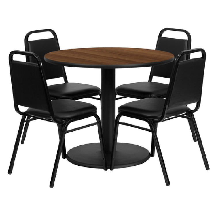 The Flash Furniture RSRB1004-GG Table and Banquet Chair Set is a versatile addition to any commercial or residential setting, offering both functionality and style. This set includes a 36" diameter x 30" high table that features a round design with a black T-mold edge and a walnut laminate finish, constructed with MDF and a high-impact melamine core for durability. The cast iron round base is finished with a black powder coating, ensuring stability and a sleek appearance. Accompanying the table are four banquet chairs, each measuring 17-1/2" wide x 20-1/4" deep x 34" high, designed to support up to 500 pounds. These chairs incorporate a trapezoidal seamless back panel and are upholstered in vinyl with a 1-1/2" thick CA117 fire retardant foam seat and back for enhanced safety and comfort. The chairs also feature double support braces, plastic bumper guards, and a 16-gauge steel frame with a black powder coated finish, ensuring long-lasting use. Additionally, plastic floor glides protect flooring surfaces. This set is shipped in four boxes with a lead time of 1-2 business days and requires assembly upon arrival, making it a practical and efficient solution for dining spaces.