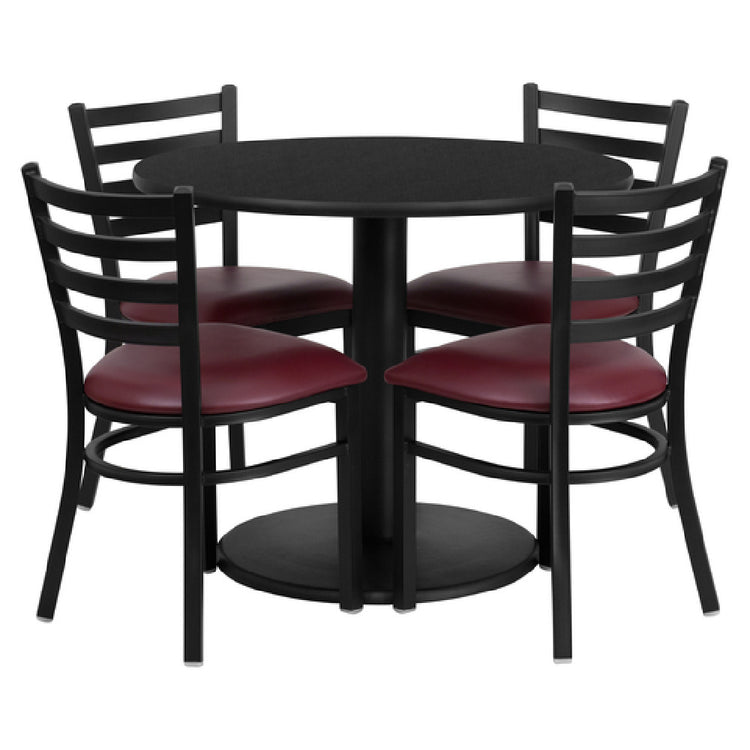 The Flash Furniture RSRB1005-GG Table and Chair Set is a versatile addition to both residential and commercial spaces, offering a blend of durability and style. The central piece of this set is a 36-inch diameter table standing 30 inches high, constructed with a black T-mold edge and a high impact melamine core for enhanced durability. The table's black laminate finish complements its robust cast iron round base, featuring a black powder-coated finish for added resilience. Accompanying the table are four chairs, each measuring 16-1/2 inches wide by 17 inches deep by 32-1/4 inches high. These chairs boast metal ladder backs and are upholstered with burgundy vinyl, offering padded seats filled with 2-1/2 inch thick CA117 fire retardant foam for safety and comfort. The chairs' frames are made from 18-gauge steel with a black powder-coated finish, ensuring long-term use, and feature welded joint assembly along with a curved support bar for added strength. Plastic floor glides protect flooring surfaces from damage. This set is shipped in five boxes with a lead time of 1-2 business days and requires assembly, making it a practical choice for various settings looking for reliable and aesthetically pleasing furniture solutions.